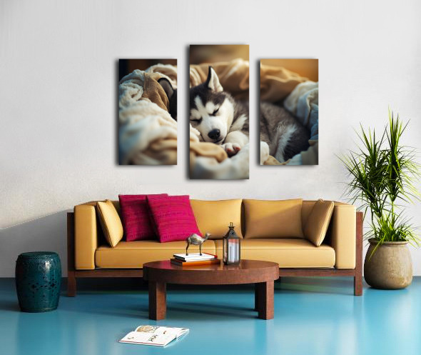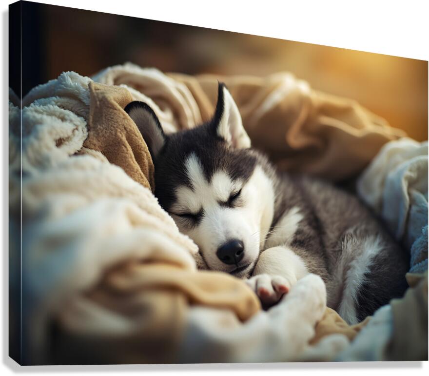 A peaceful gray and white Siberian Husky puppy sleeps contentedly curled up in a cozy nest created from clean towels and soft clothing Digital Artwork.