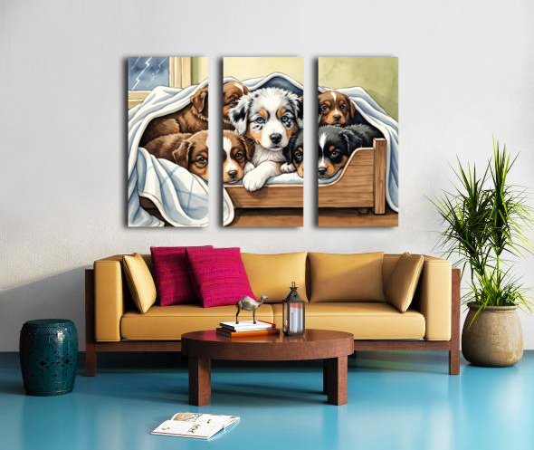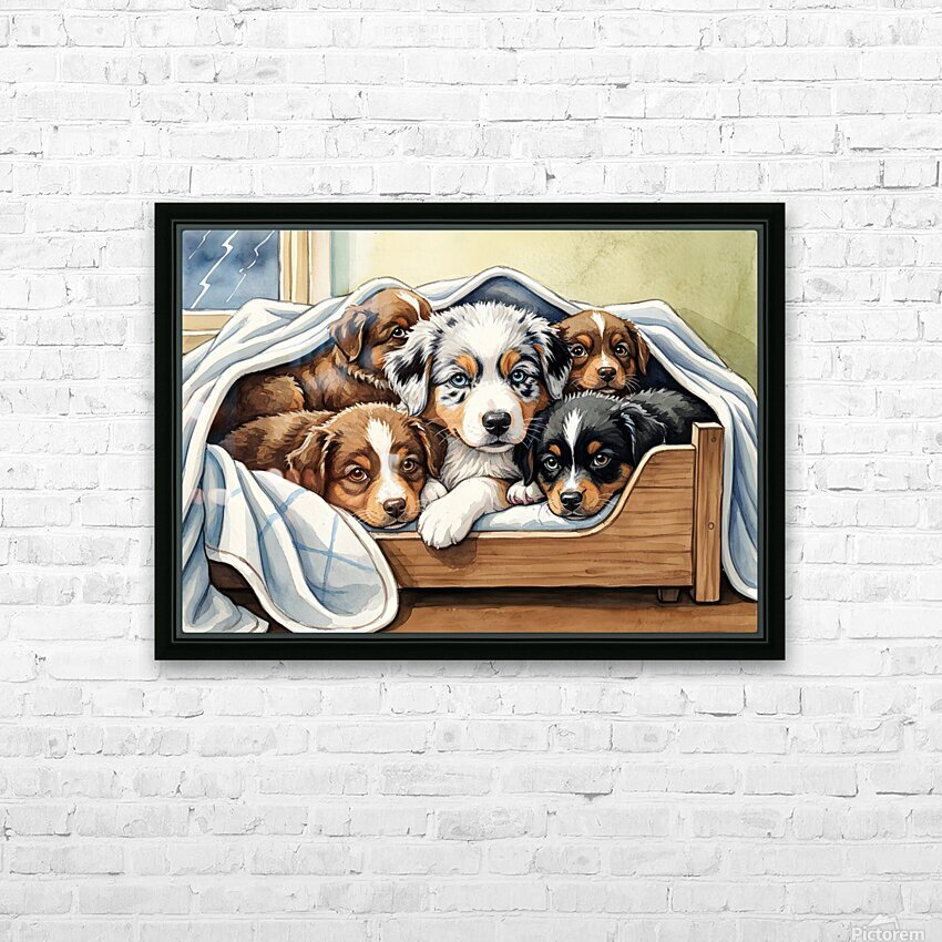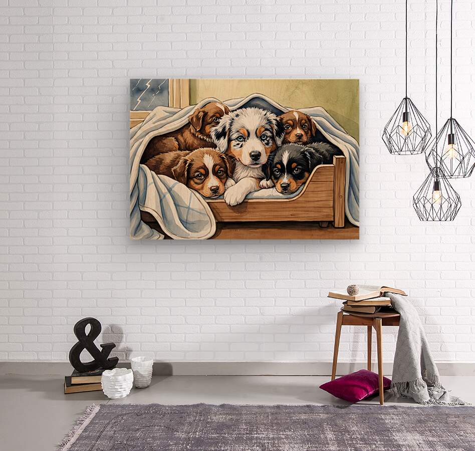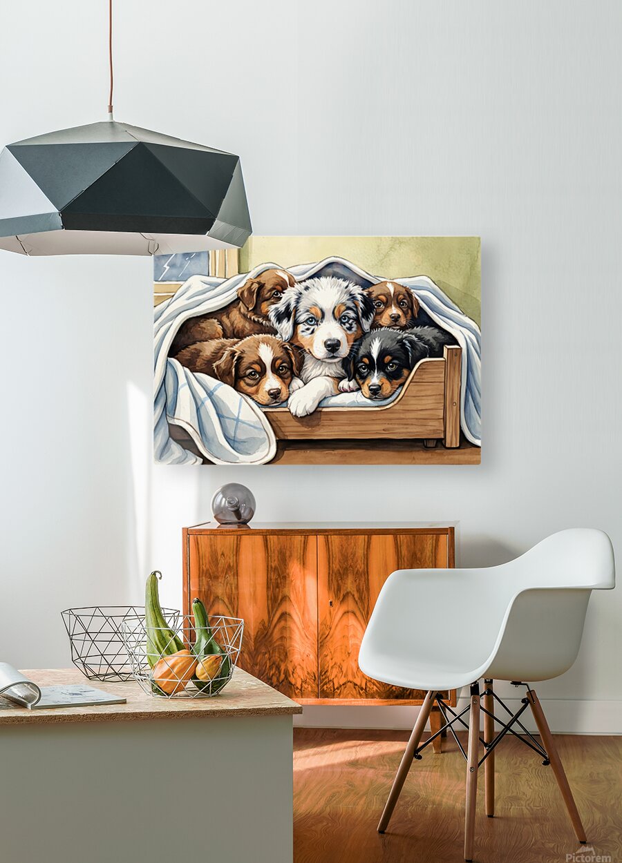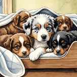 A blue merle Australian Shepherd puppy with striking blue eyes snuggles closely with brown and black siblings in their shared wooden bed. Soft blankets surround the group as they huddle together for warmth and comfort during the stormy weather. Digital Artwork.