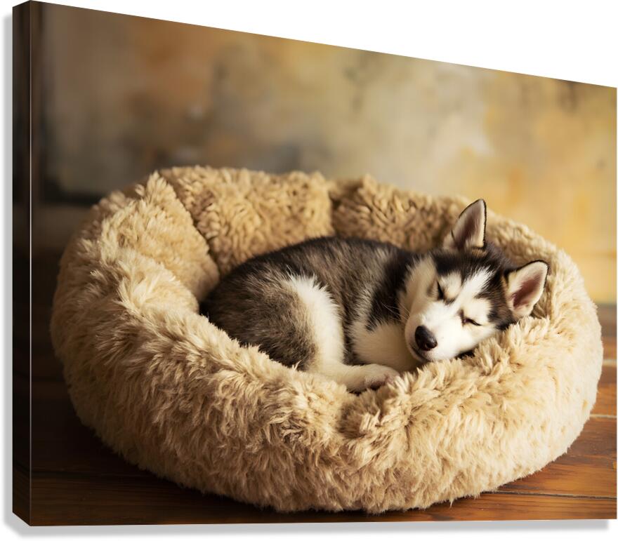 A small black and white Siberian Husky puppy sleeps peacefully curled up in a tiny ball in one corner of an enormous beige dog bed the vast cushioned surface extending far beyond the sleeping pup Digital Artwork.