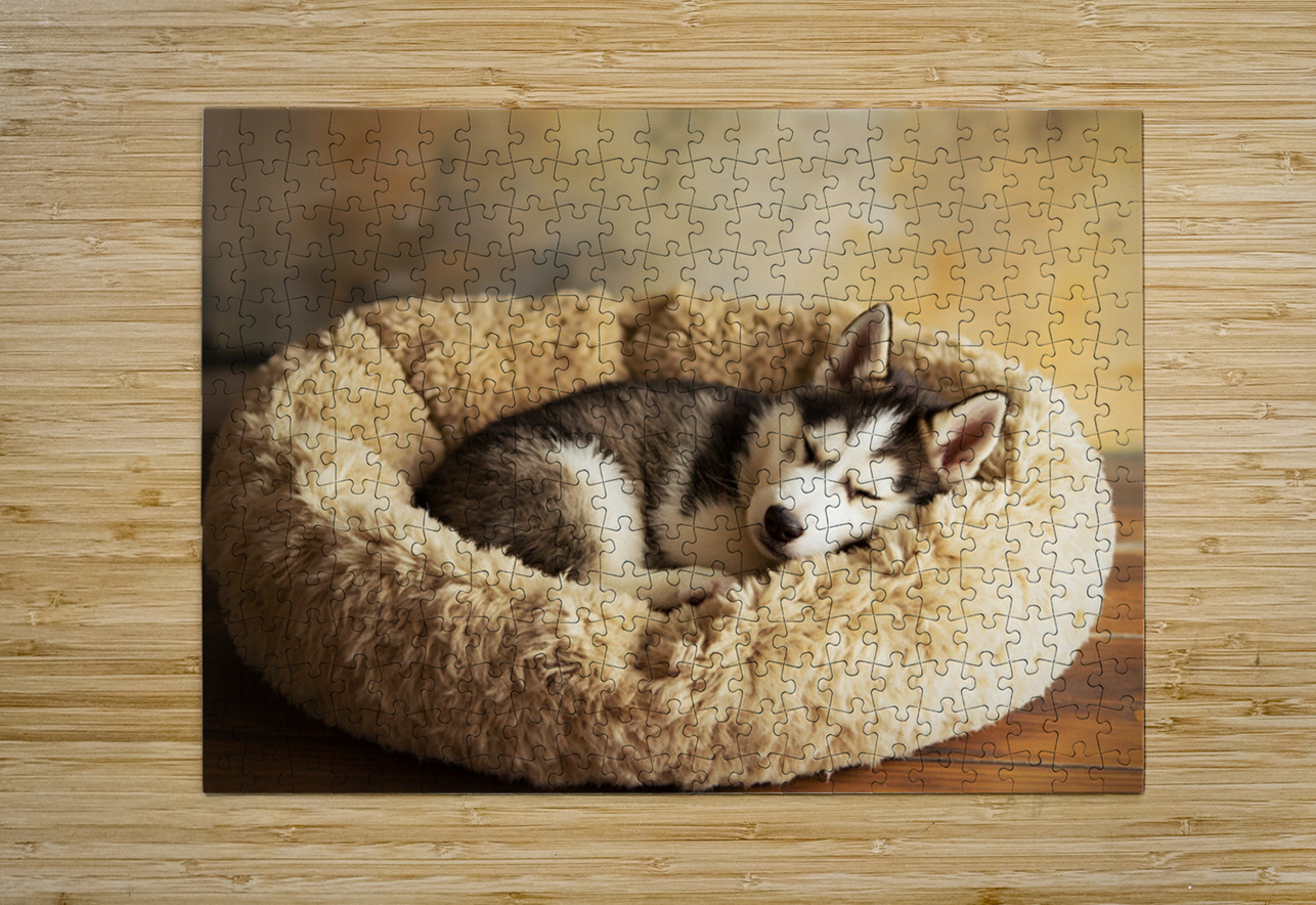 Sleepy Husky Puppy Napping In Corner Of Giant Bed Puppy Prints Puzzle printing