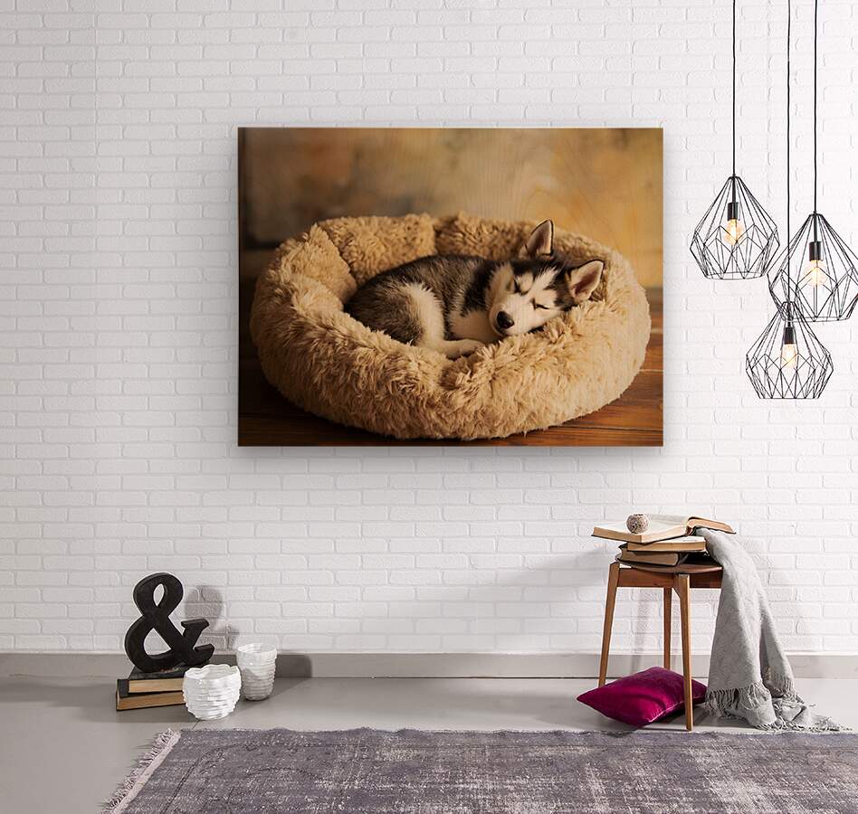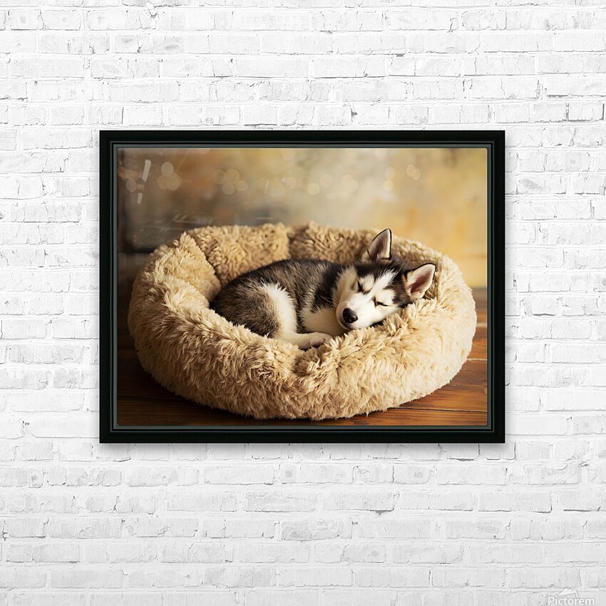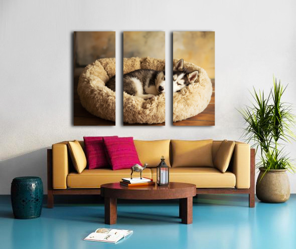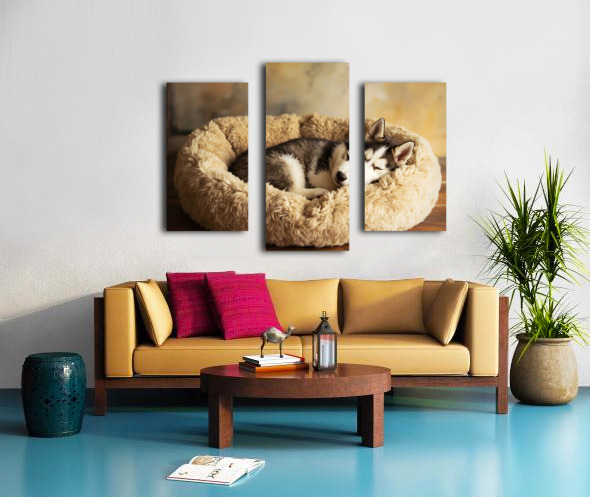 Sleepy Husky Puppy Napping In Corner Of Giant Bed Picture Frame Printing