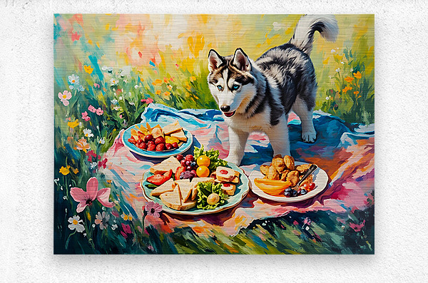 Get this artwork "Husky Puppy Discovers Picnic Spread" in a framed print.