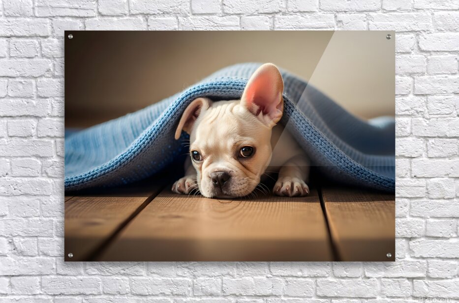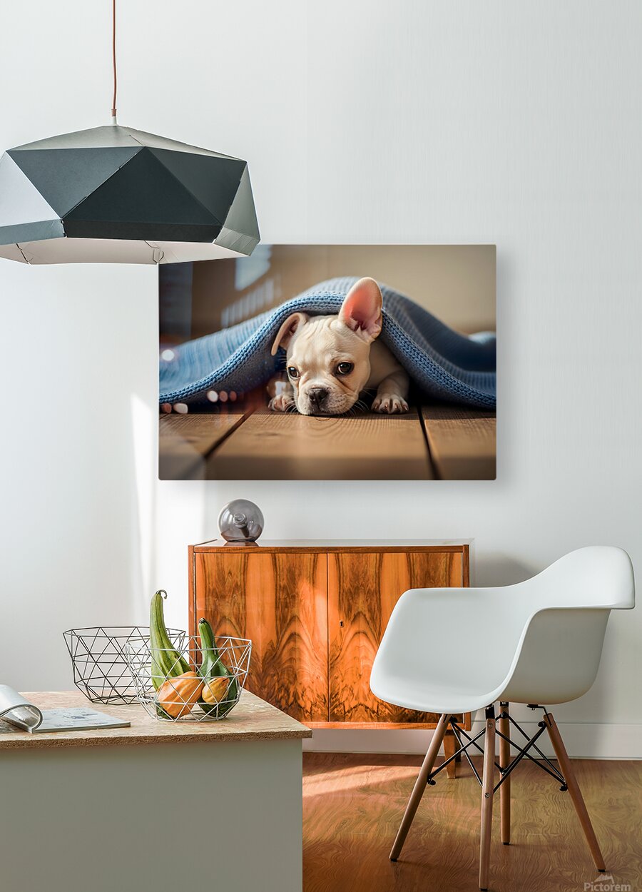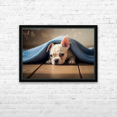 French Bulldog Puppy Discovers Cozy Blanket Adventure Frame print