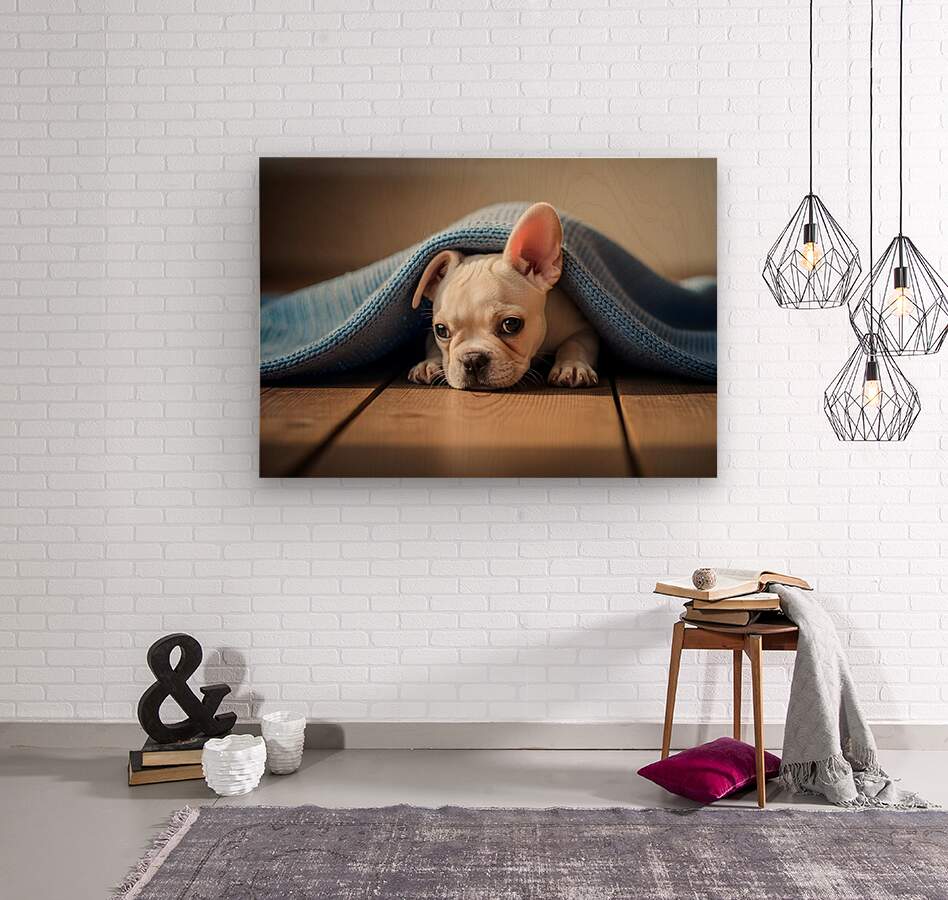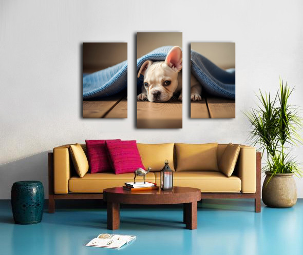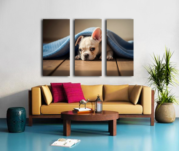 French Bulldog Puppy Discovers Cozy Blanket Adventure Canvas print