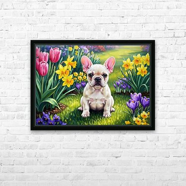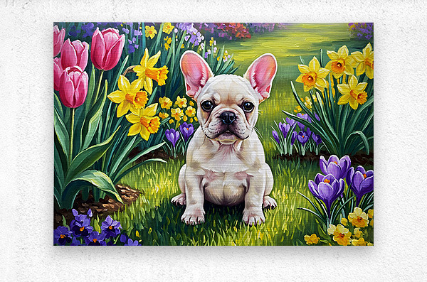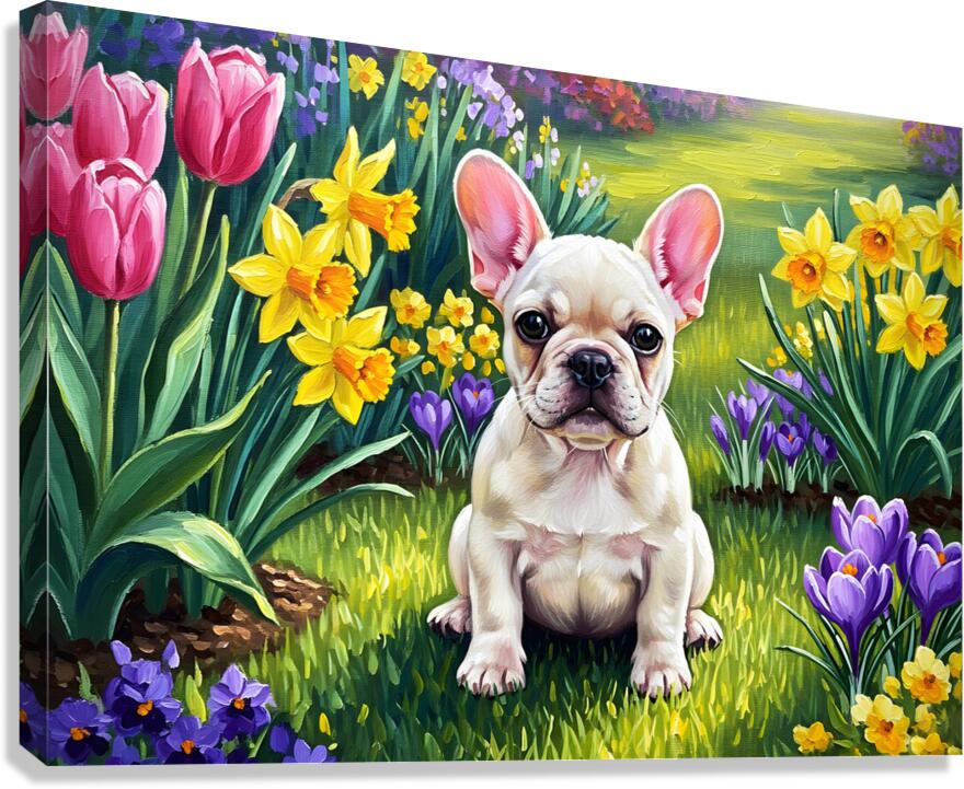 Get this artwork "French Bulldog Puppy Discovers Spring Garden" in a framed print.