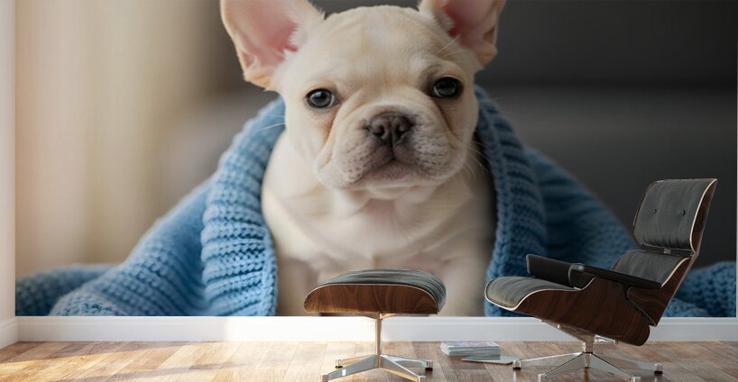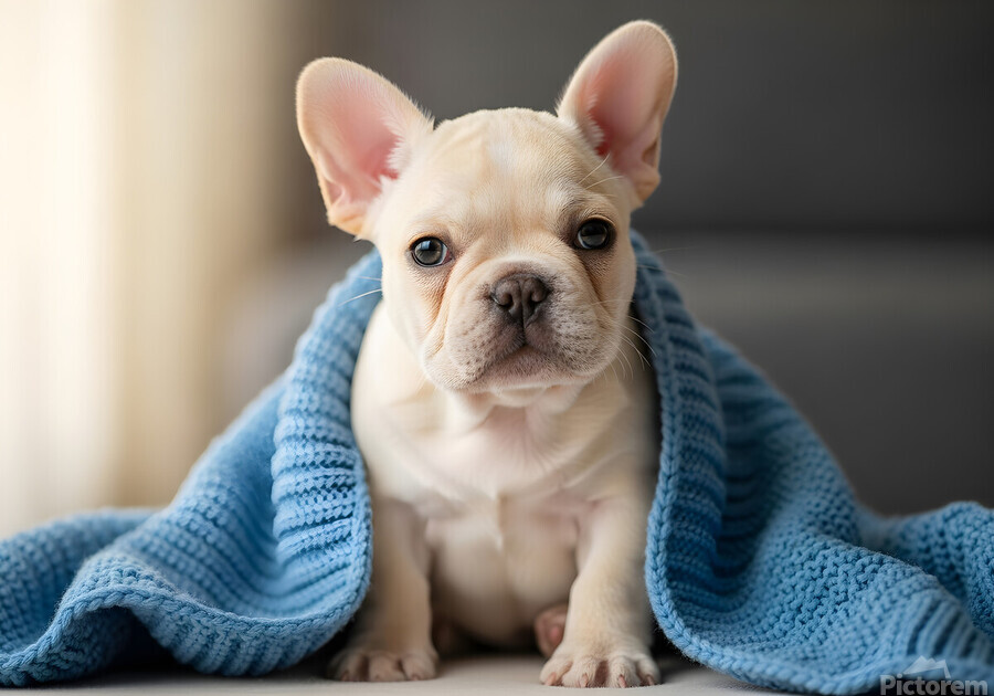 The cream-colored French Bulldog puppy sits peacefully beside the soft blue knitted blanket which drapes partially around its small form. The little d...[+]