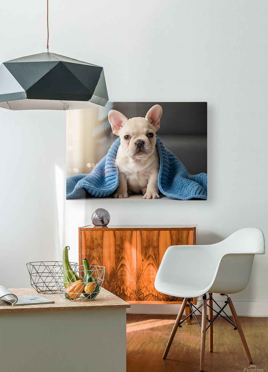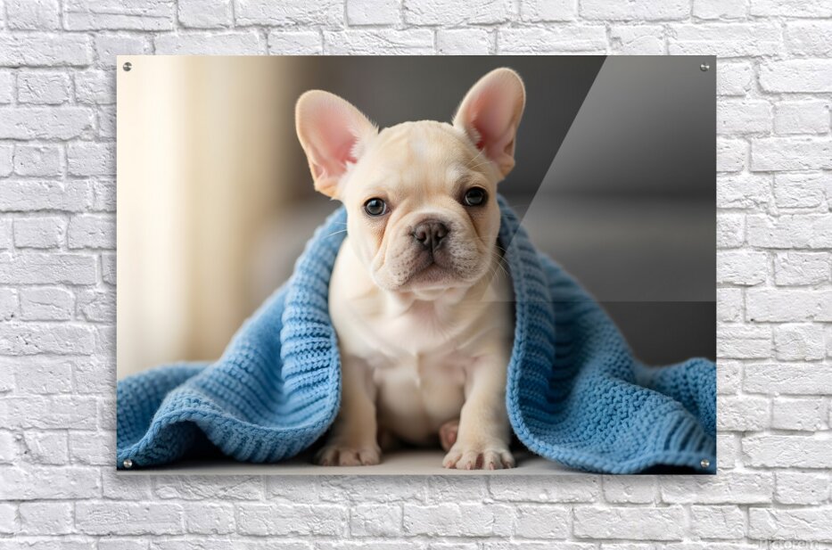 French Bulldog Puppy Snuggles With Favorite Blue Blanket Picture Frame Printing