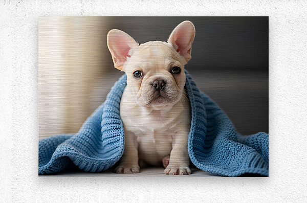 Get this artwork "French Bulldog Puppy Snuggles With Favorite Blue Blanket" in a framed print.