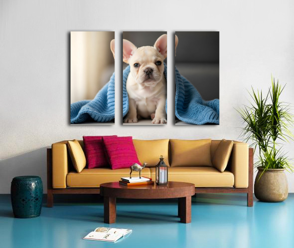 French Bulldog Puppy Snuggles With Favorite Blue Blanket Canvas print