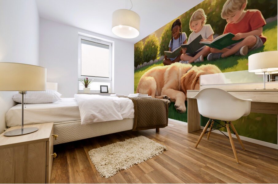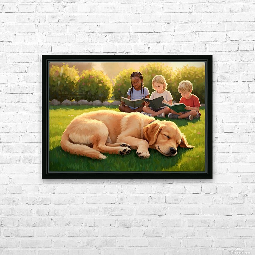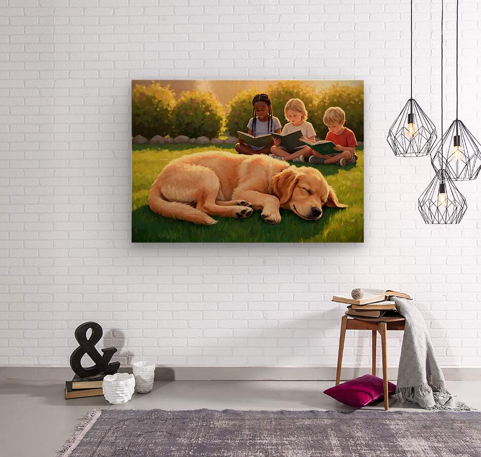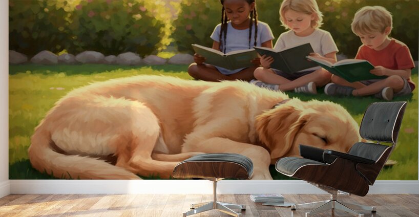 A peaceful golden retriever puppy sleeps contentedly curled up on green grass while thoughtful children sit quietly nearby with books basking in warm late afternoon sunlight Digital Artwork.