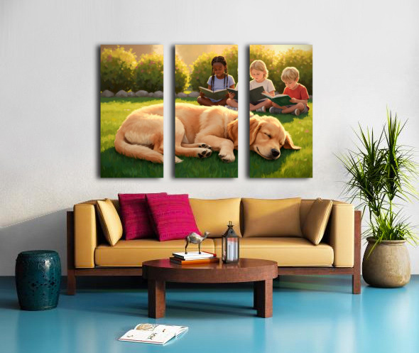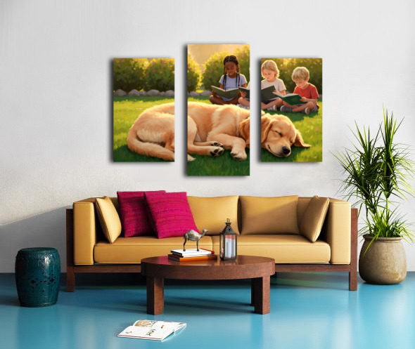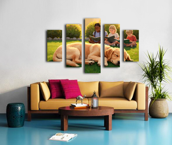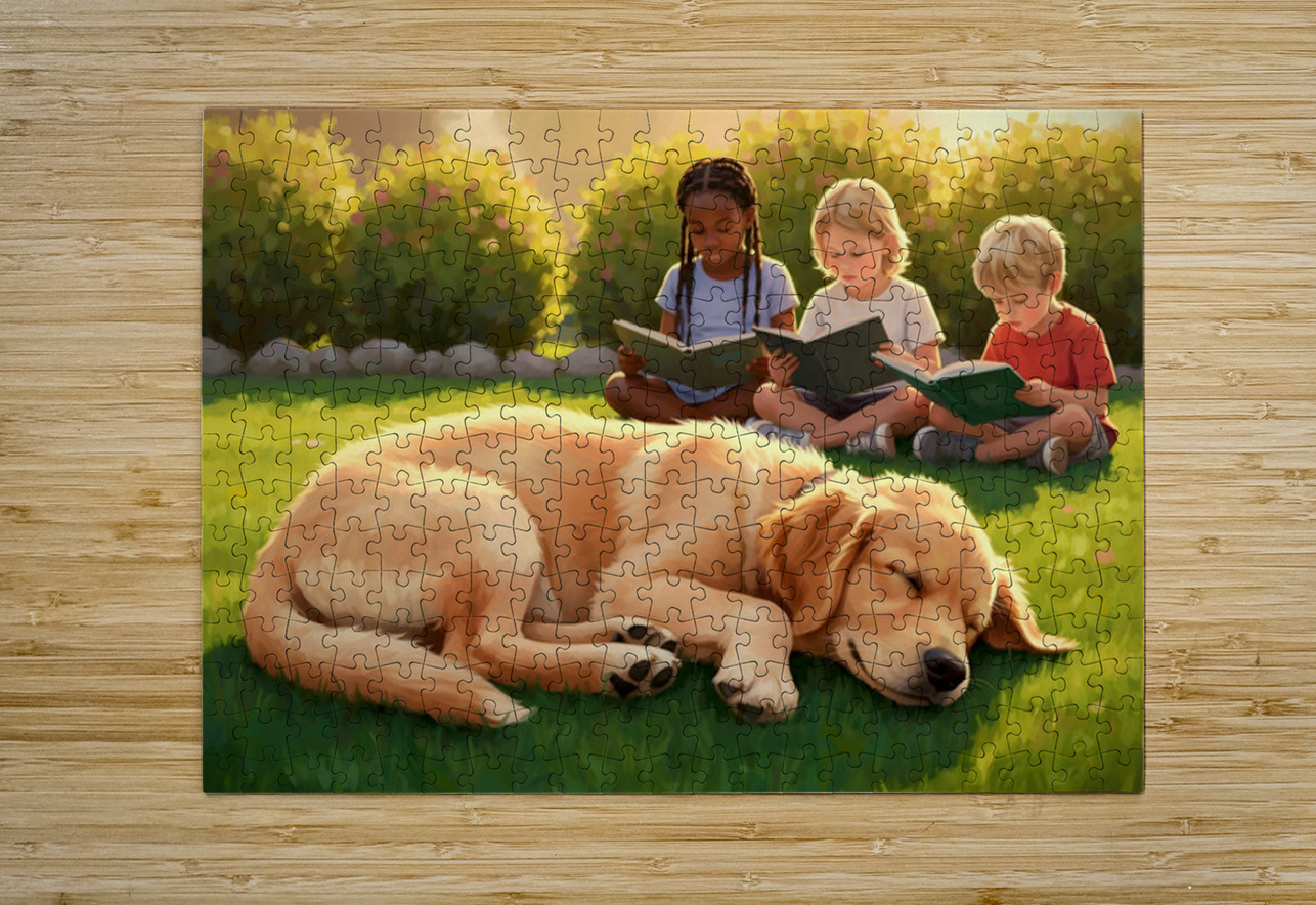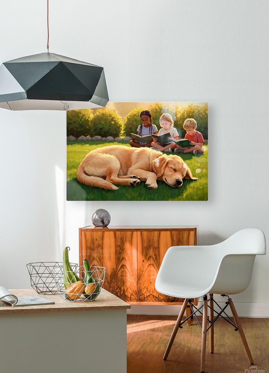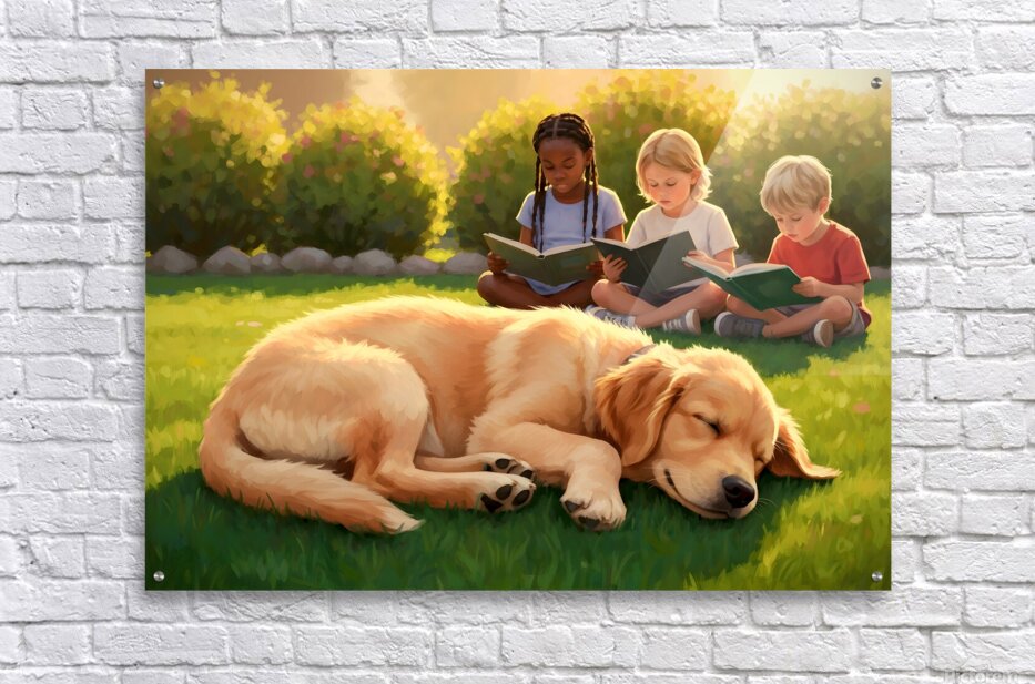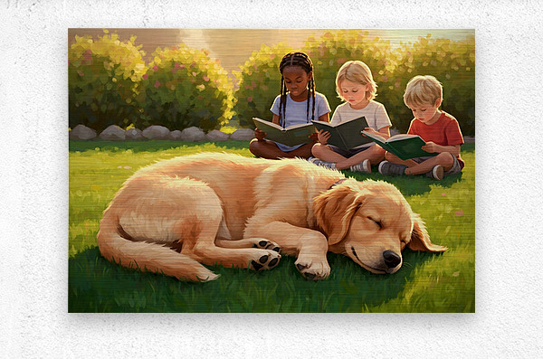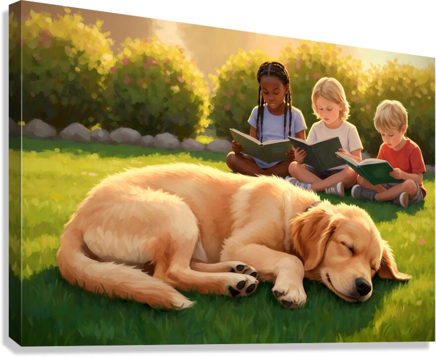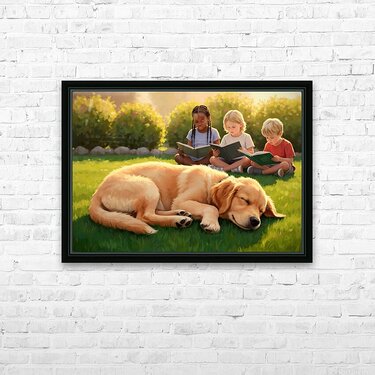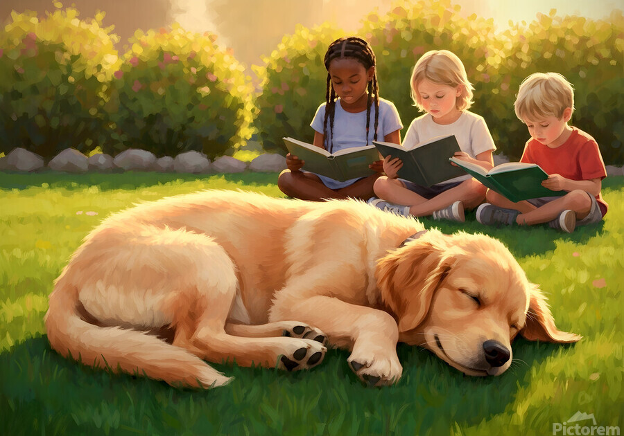 A peaceful golden retriever puppy sleeps contentedly curled up on green grass while thoughtful children sit quietly nearby with books basking in warm late afternoon sunlight Digital Artwork.