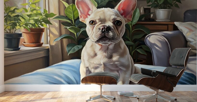 A cream-colored French Bulldog puppy sits upright on a soft blue cushion in a warm sunlit living room. The puppy appears alert and attentive with perked ears and bright eyes surrounded by softly blurred houseplants. Digital Artwork.