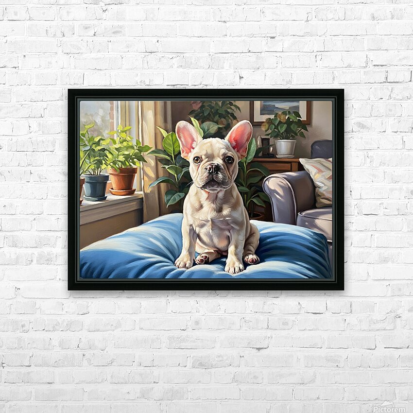 Get this artwork "French Bulldog Puppy Sits Alert On Blue Cushion" in a framed print.