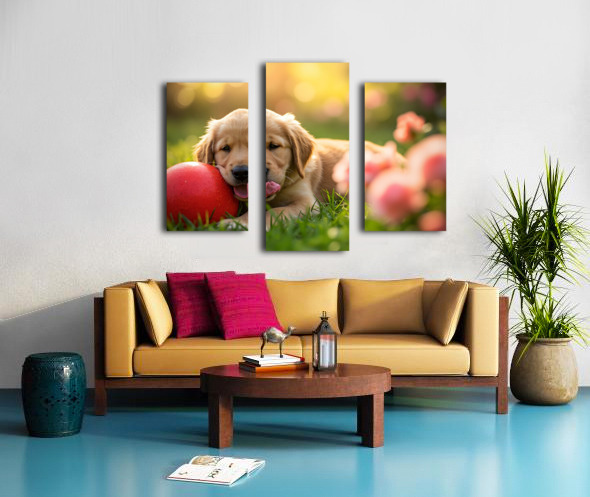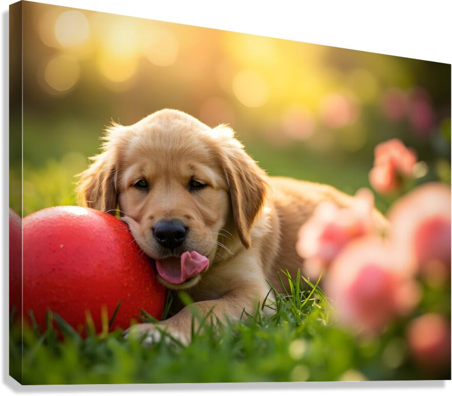 Exhausted Golden Retriever Puppy Rests Beside The Giant Ball Canvas print