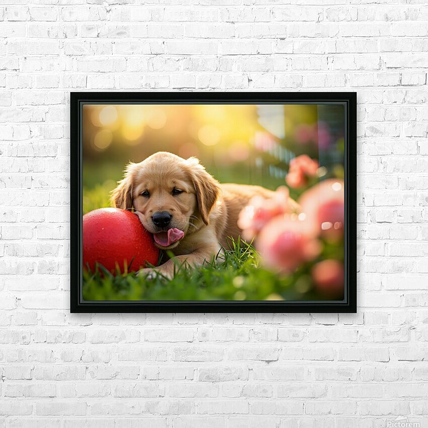 Get this artwork "Exhausted Golden Retriever Puppy Rests Beside The Giant Ball" in a framed print.