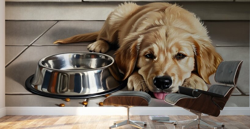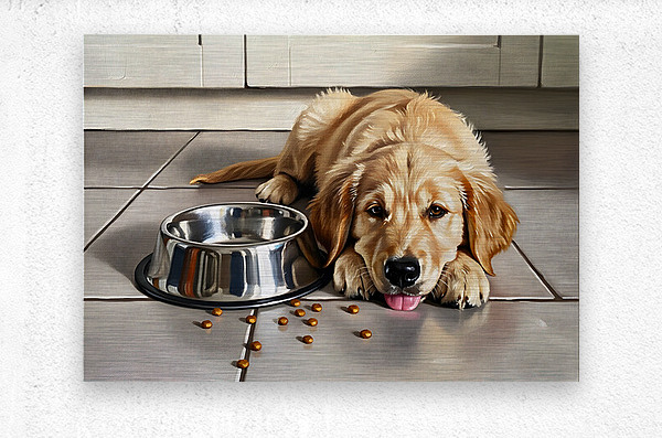 The golden retriever puppy sits contentedly beside the empty silver bowl with a few kibble crumbs scattered around. Its pink tongue peeks out slightly and its amber eyes look sleepy and satisfied after the delicious meal. Digital Artwork.