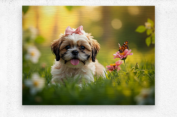 A peaceful white and brown Shih Tzu puppy with a pink bow relaxes on soft grass gazing serenely as the orange and black butterfly drifts away among blurred lavender and white wildflowers. Digital Artwork.