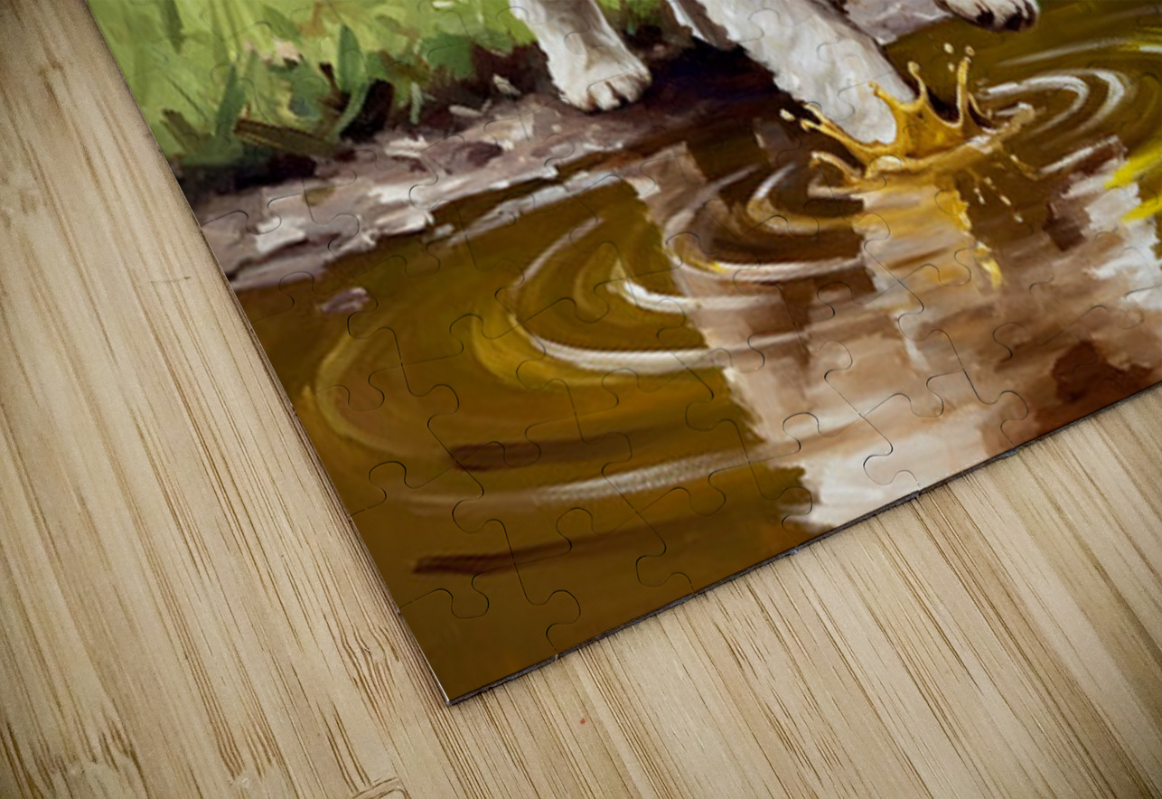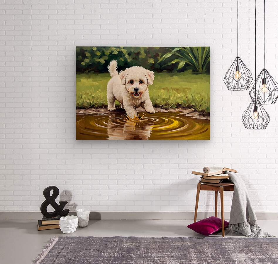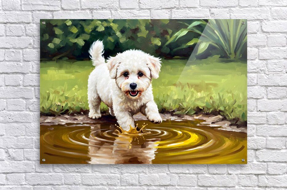ABOUT THIS ARTWORK: BICHON FRISE PUPPY DISCOVERS MUDDY PUDDLE