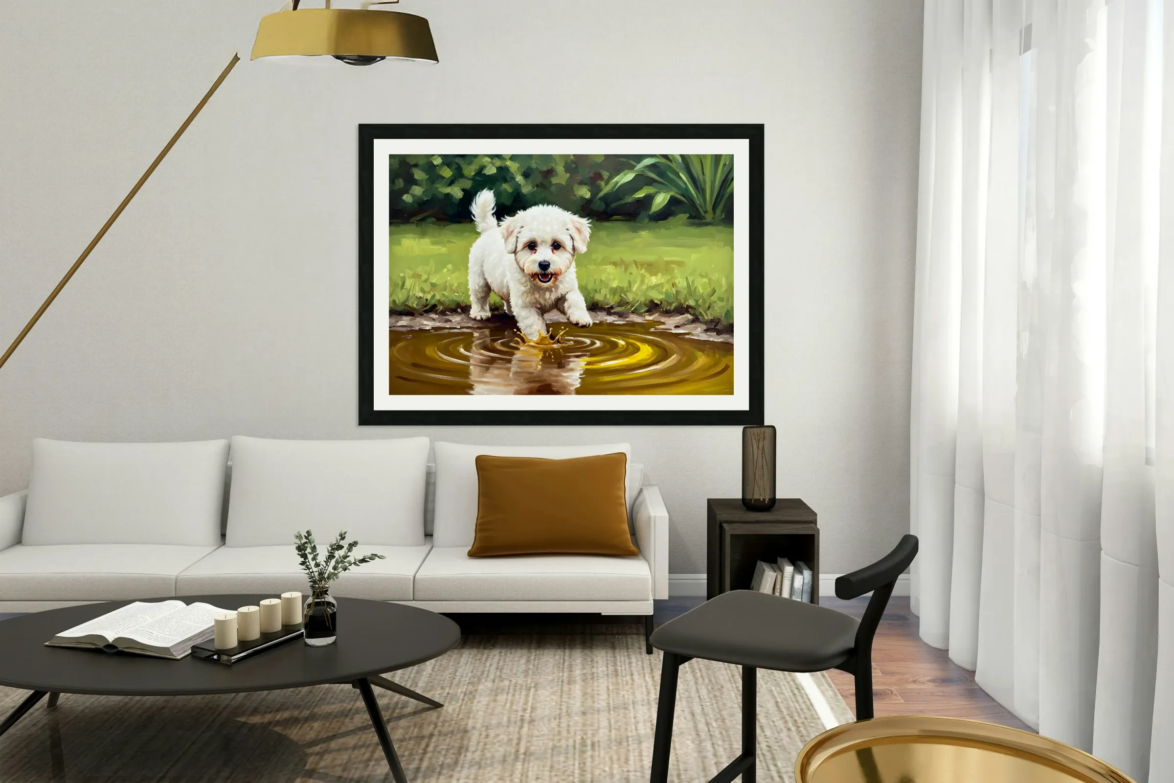 ABOUT THIS ARTWORK: BICHON FRISE PUPPY DISCOVERS MUDDY PUDDLE