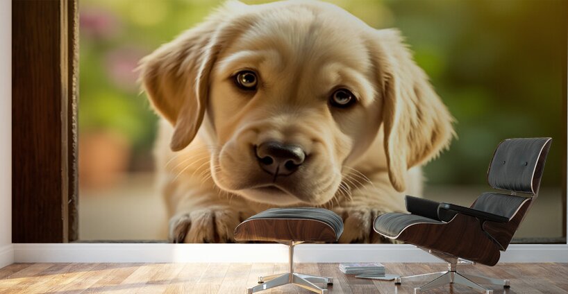 A golden Labrador puppy with soft fluffy coat examines a white cat flap with intense curiosity pressing his small black nose against the plastic door while his tail shows excitement in a cozy kitchen environment. Digital Artwork.