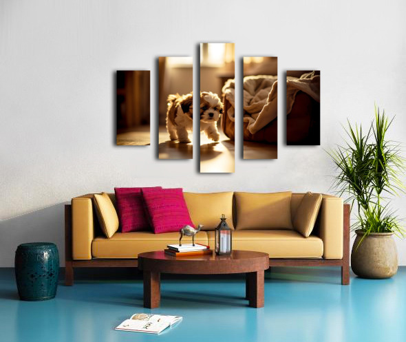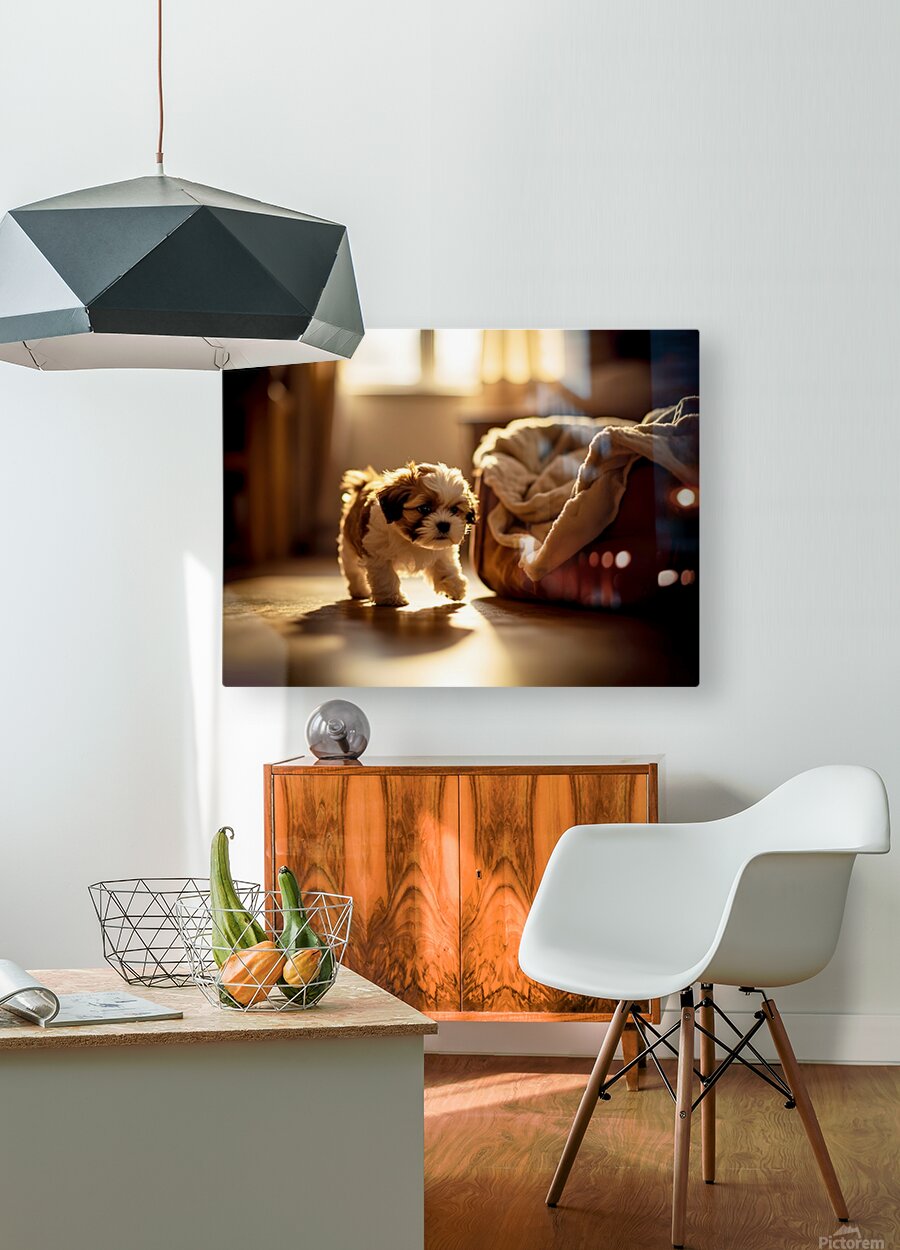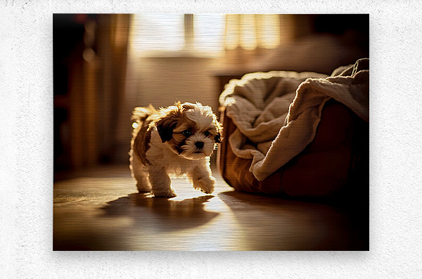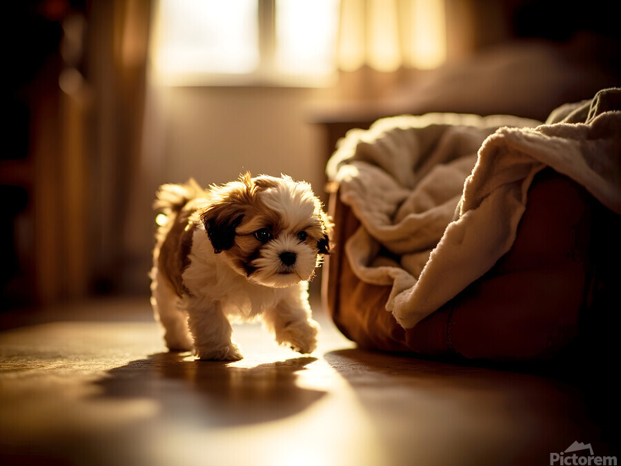 A adorable brown and white Shih Tzu puppy sits on carpet in a warmly lit bedroom showing signs of sleepiness with droopy eyes and relaxed posture as bedtime approaches Digital Artwork.