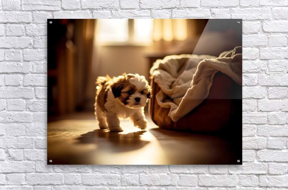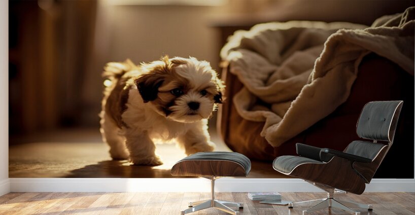 A adorable brown and white Shih Tzu puppy sits on carpet in a warmly lit bedroom showing signs of sleepiness with droopy eyes and relaxed posture as bedtime approaches Digital Artwork.