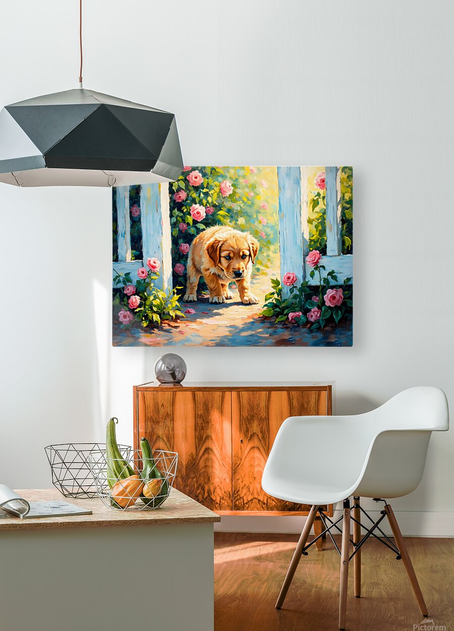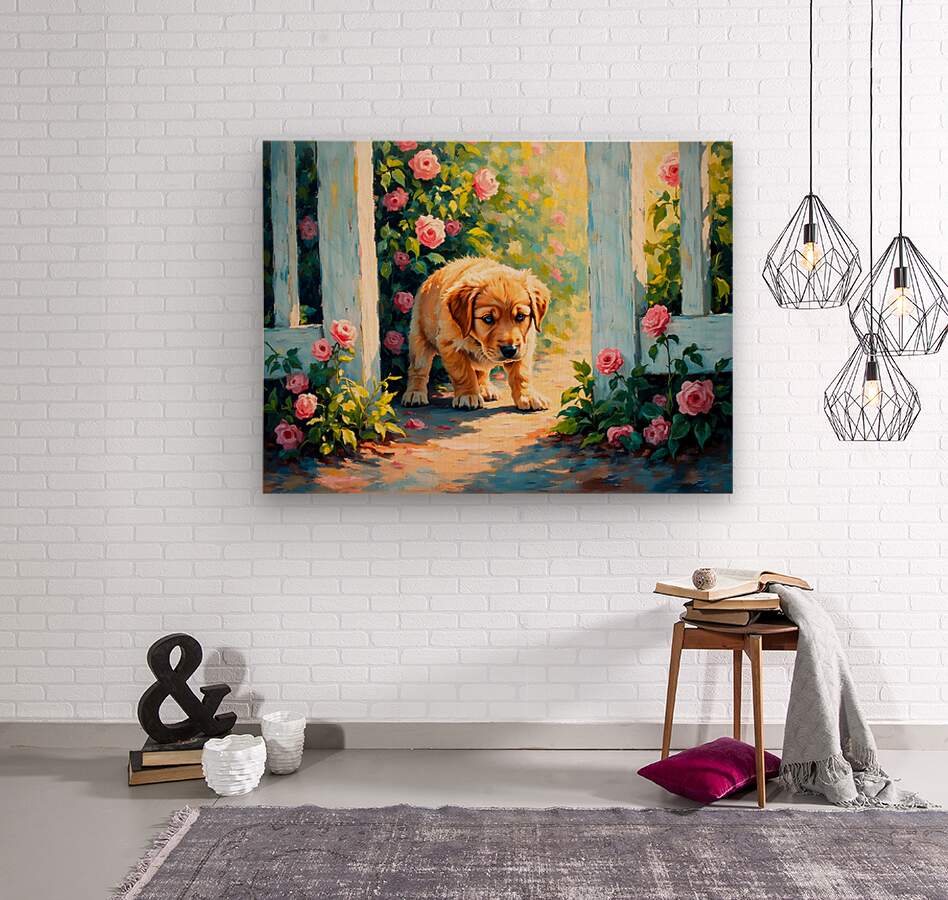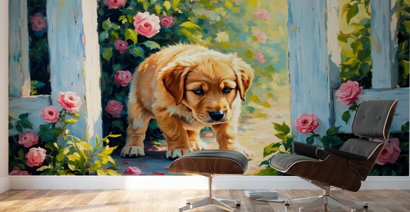 ABOUT THIS ARTWORK: HAPPY LABRADOR RETRIEVER PUPPY EMERGING FROM BEHIND BRICK WALL