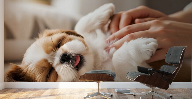 A thoroughly content golden and white Shih Tzu puppy rests peacefully on its side with a gentle smile fluffy fur slightly mussed from the perfect belly rub session Digital Artwork.