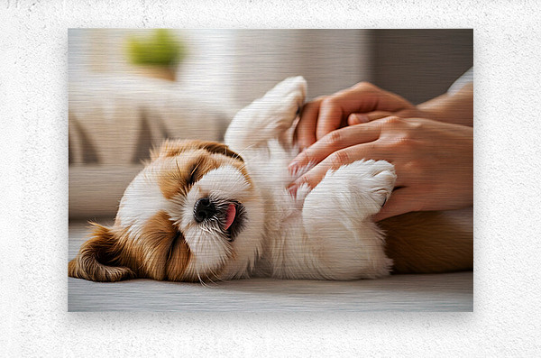 A thoroughly content golden and white Shih Tzu puppy rests peacefully on its side with a gentle smile fluffy fur slightly mussed from the perfect belly rub session Digital Artwork.