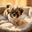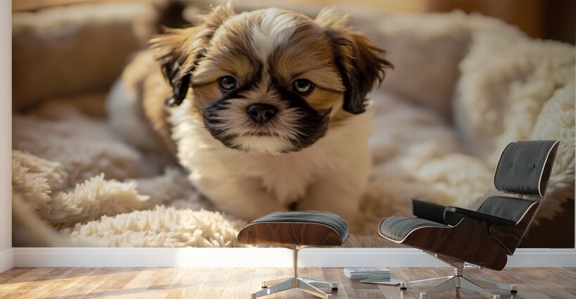 The adorable brown and white Shih Tzu puppy sleeps peacefully curled up in soft blankets with gentle moonlight creating a serene nighttime atmosphere in the bedroom Digital Artwork.