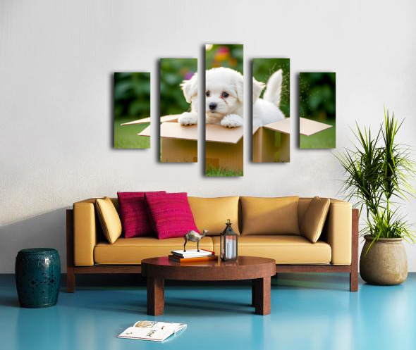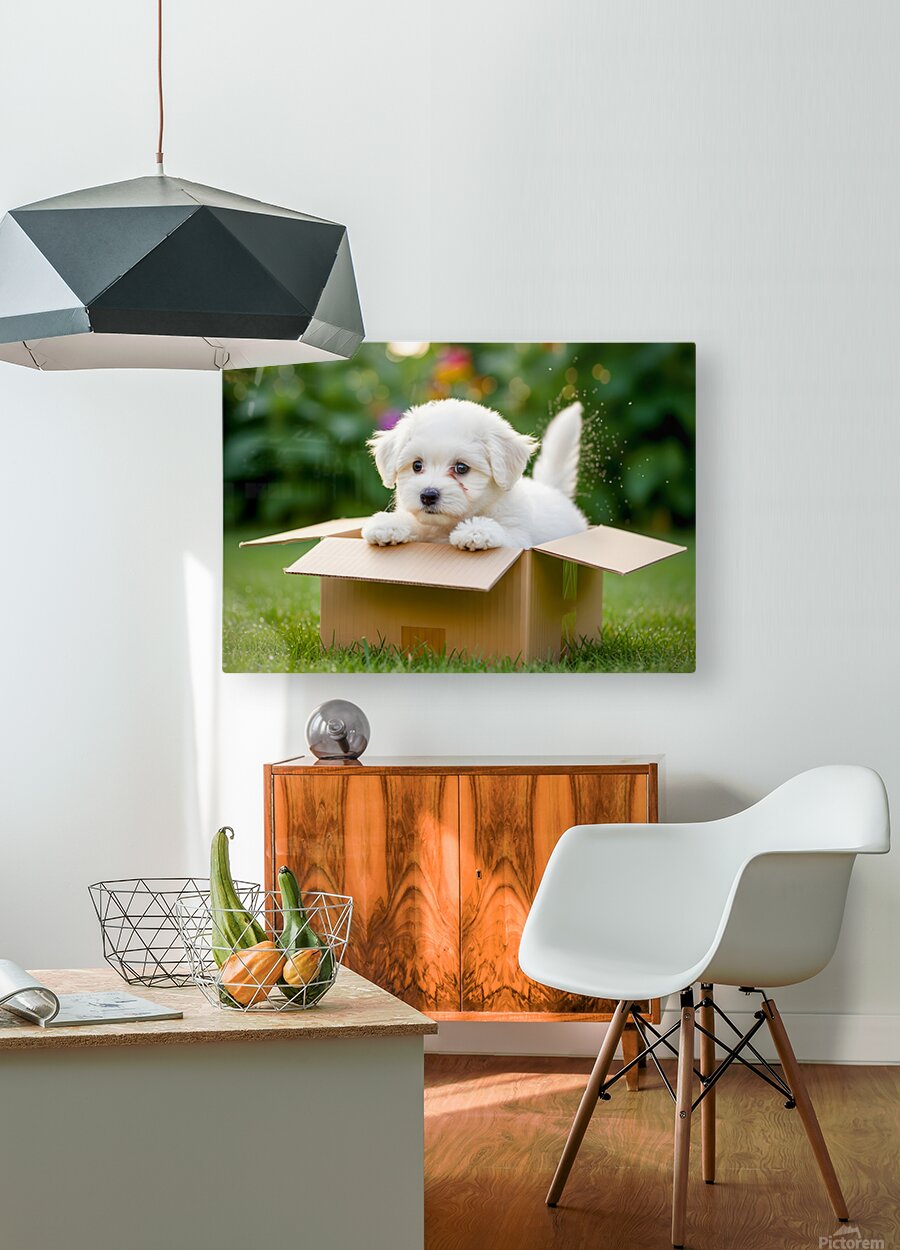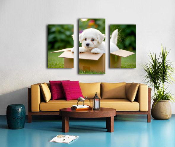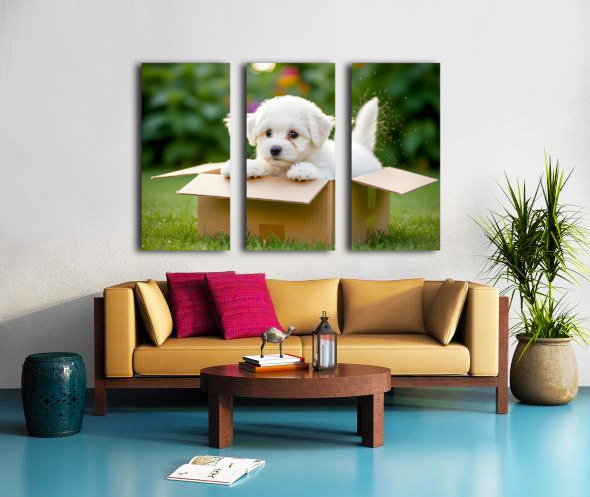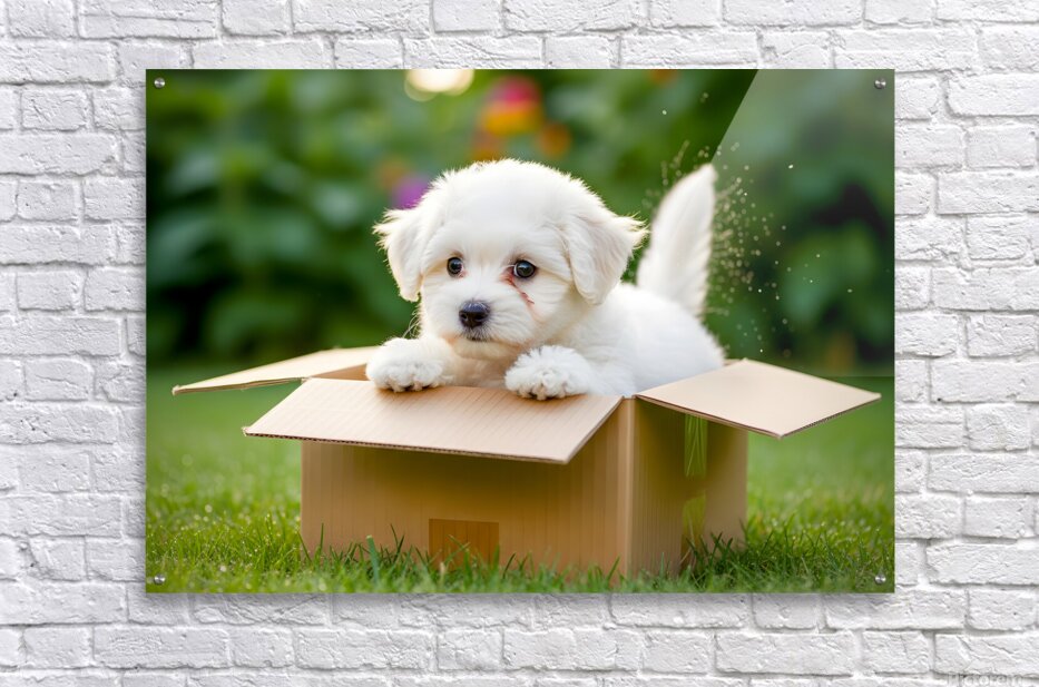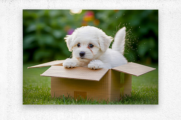 ABOUT THIS ARTWORK: HAPPY BICHON FRISE PUPPY WITH DISCOVERED TOY TREASURES
