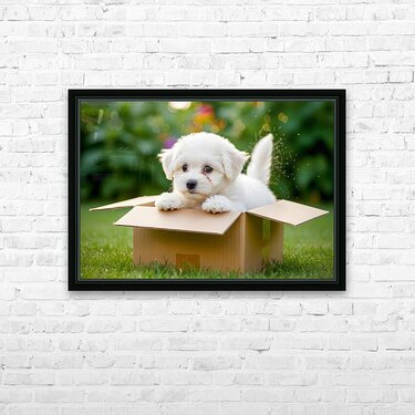 Happy Bichon Frise Puppy With Discovered Toy Treasures Picture Frame Printing