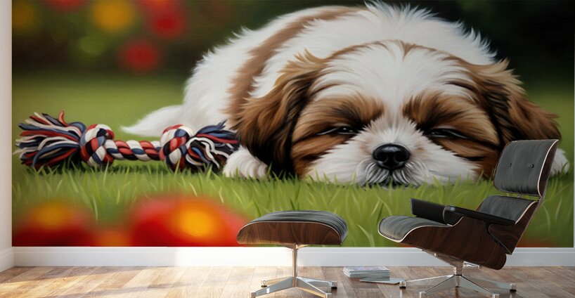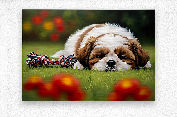 The adorable white and brown Shih Tzu puppy sleeps soundly on the grass curled up in a perfect little ball with the rope toy secured under a tiny paw completely peaceful after the fun playtime. Digital Artwork.