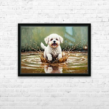 Get this artwork "Muddy Bichon Frise Puppy After Puddle Adventure" in a framed print.