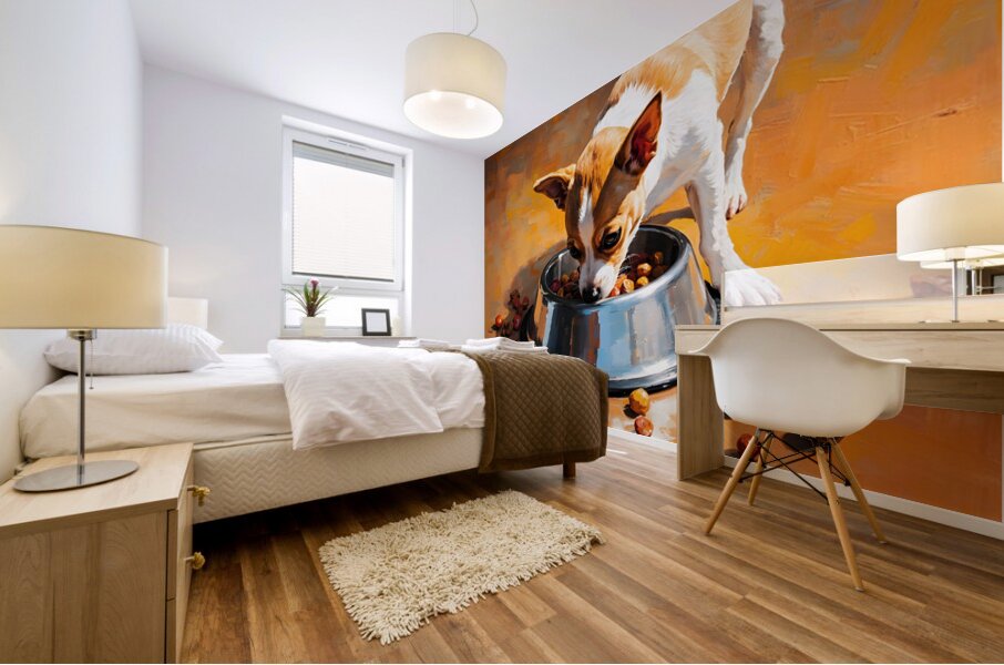 ABOUT THIS ARTWORK: CHIHUAHUA PUPPY DISCOVERS FOOD BOWL