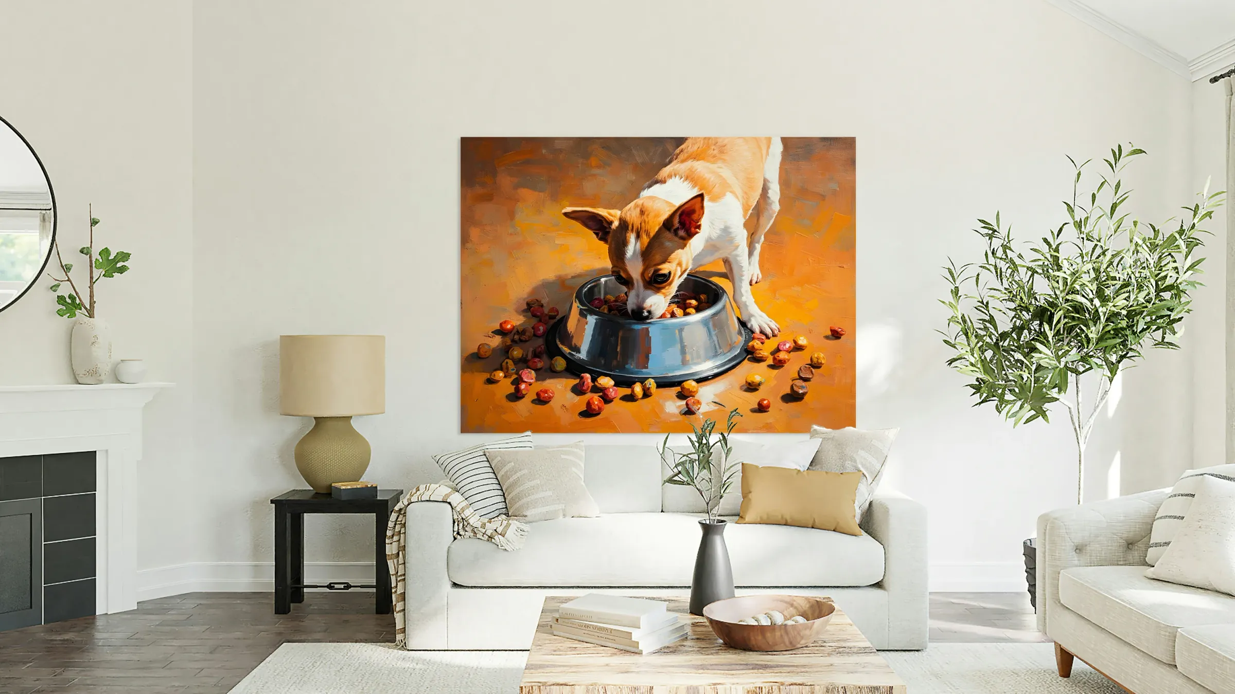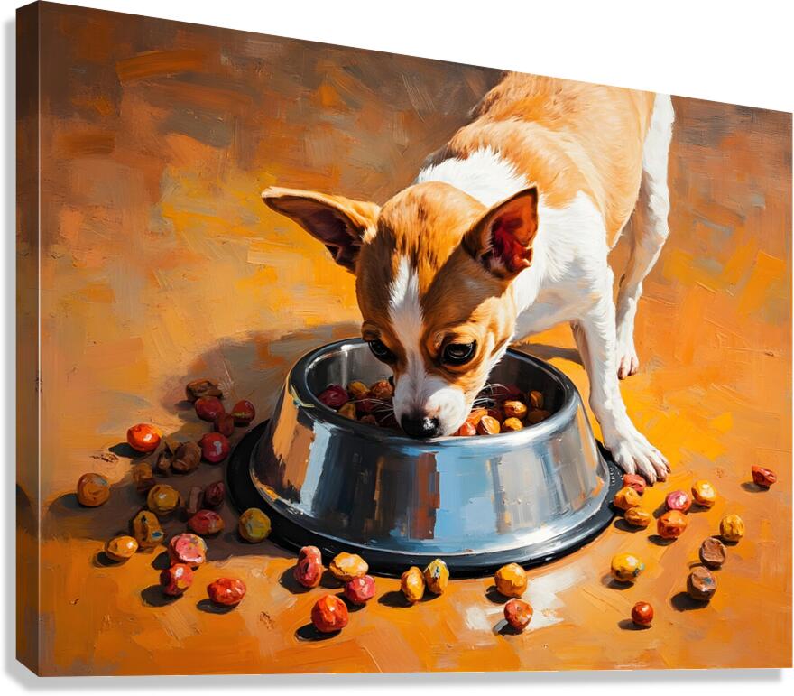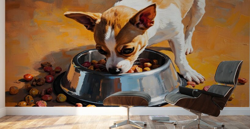 A small tan and white Chihuahua puppy sits beside a shiny metal food bowl filled with brown kibble on wooden kitchen flooring. Soft natural light illuminates the scene. Digital Artwork.