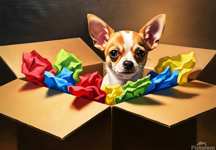 A tired tan and white Chihuahua puppy rests peacefully beside a collection of colorful ribbons and bows from opened presents. The sleepy pups eyes are nearly closed as it settles down for a well-deserved nap after an exciting day of holiday exploration. Digital Artwork.