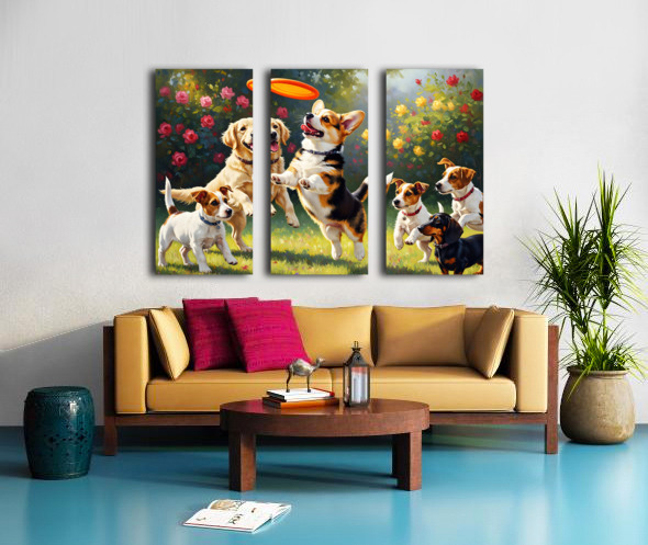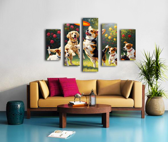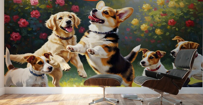 A tri-colored Pembroke Welsh Corgi puppy with distinctive short legs and pointed ears crouches playfully on grass gazing upward at an orange frisbee soaring above while other puppies gather around in an outdoor setting. Digital Artwork.