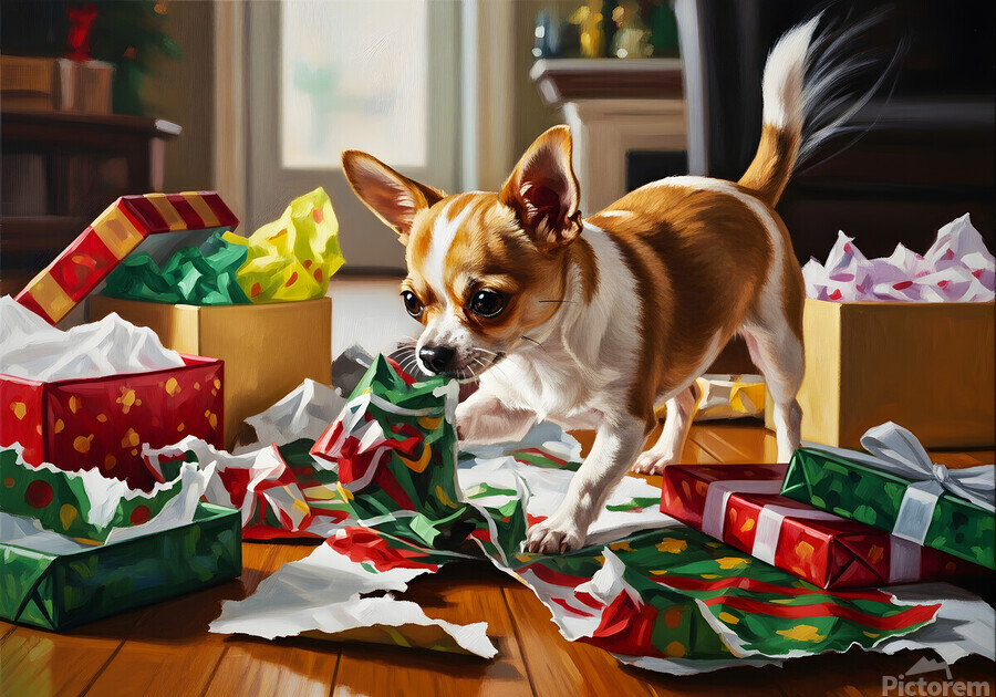 An adorable tan and white Chihuahua puppy sits surrounded by festively wrapped presents in red green and gold wrapping paper. The tiny dogs ears are perked up with curiosity as colorful ribbons and bows create a magical holiday scene around the excited pup. Digital Artwork.
