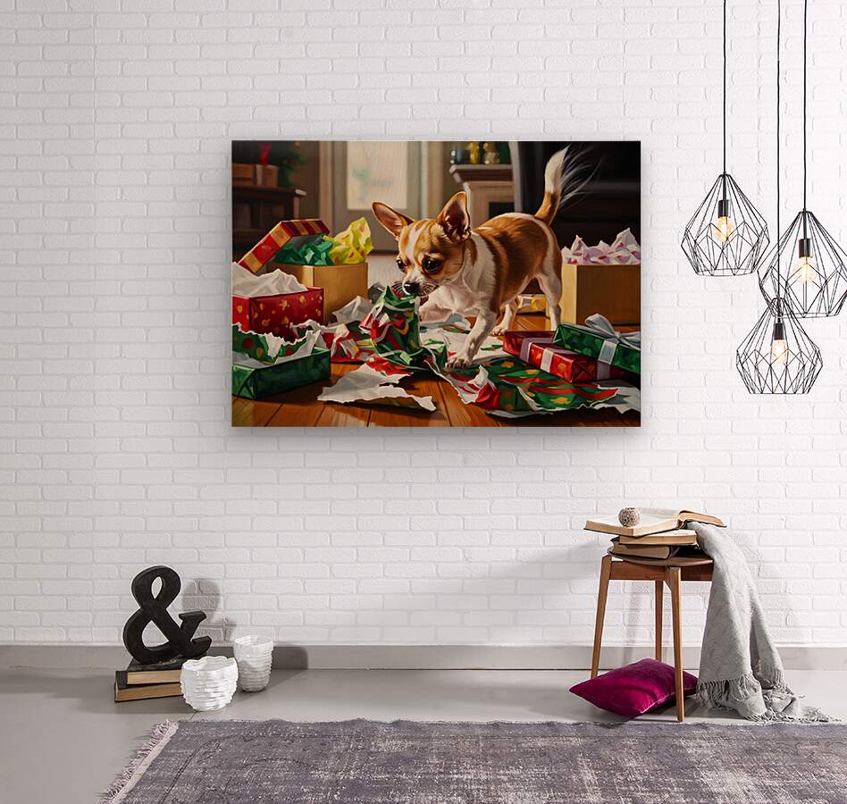 ABOUT THIS ARTWORK: CHIHUAHUA PUPPY DISCOVERS CHRISTMAS MORNING SURPRISES
