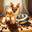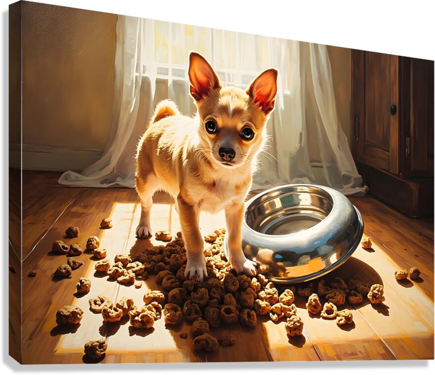 The adorable tan and white Chihuahua puppy sits surrounded by scattered brown kibble on wooden flooring looking up with big guilty eyes while the empty overturned bowl lies nearby. Digital Artwork.