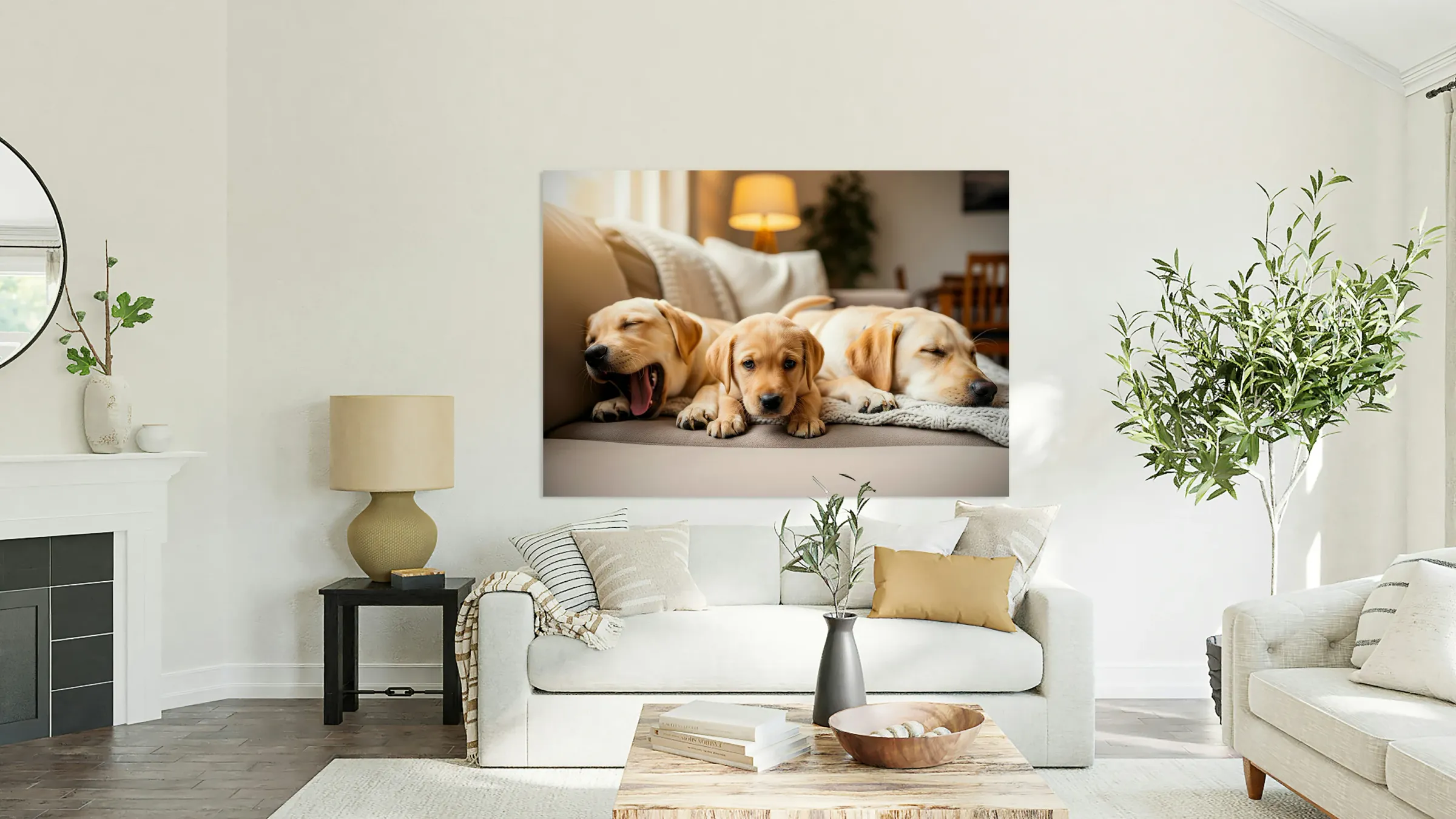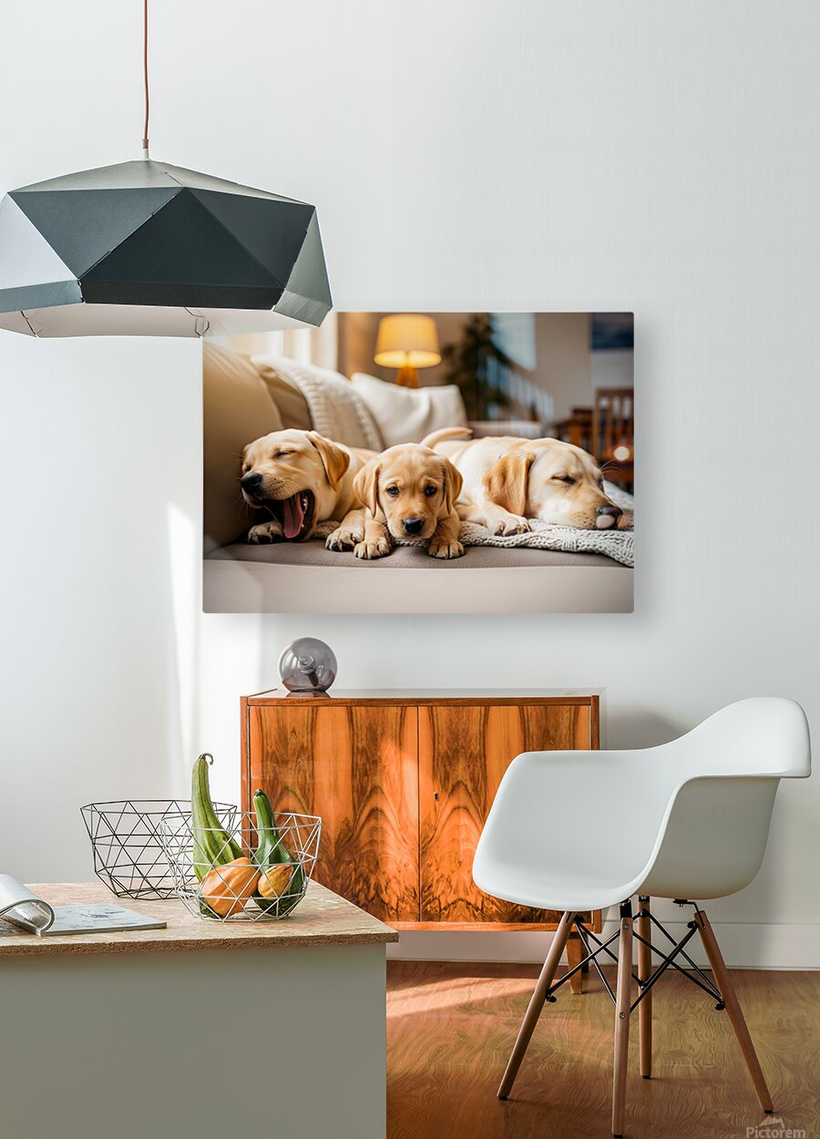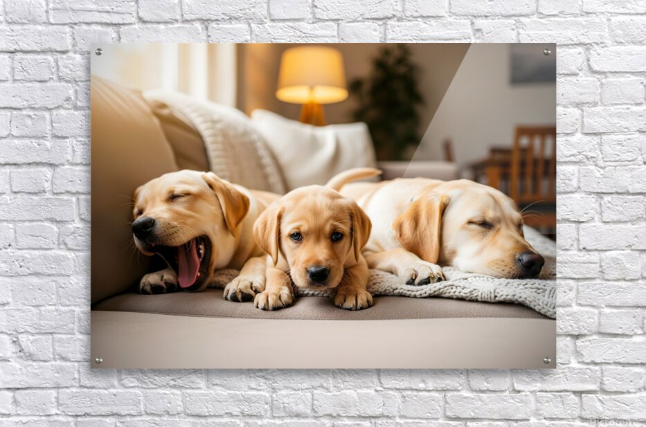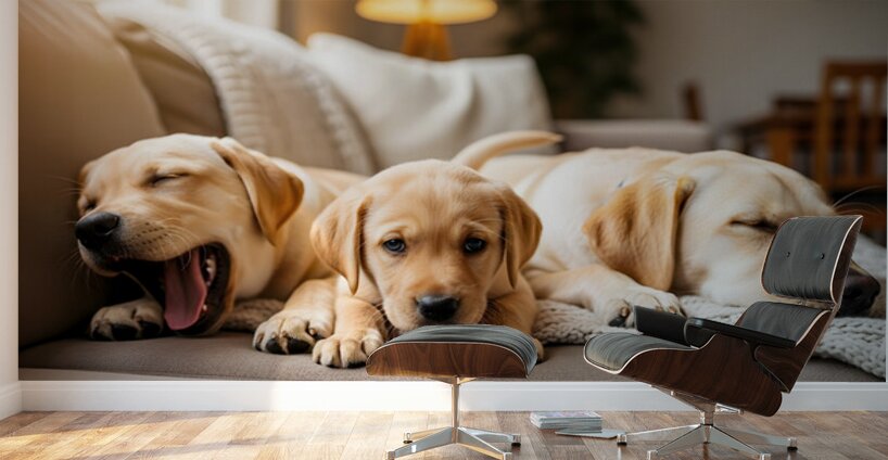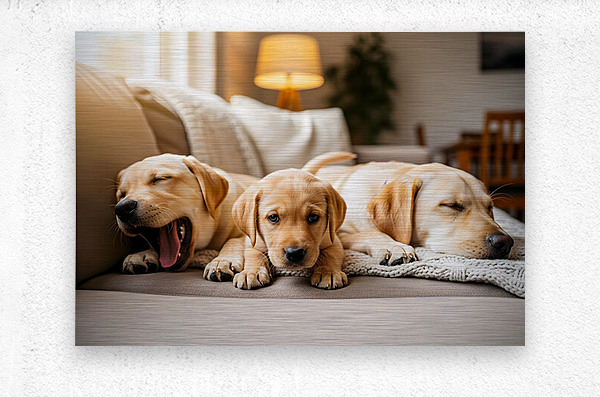A young golden Labrador Retriever puppy sits among a group of other puppies on a beige couch. The puppies are various colors and breeds all snuggled together in the cozy indoor setting with warm natural lighting. Digital Artwork.