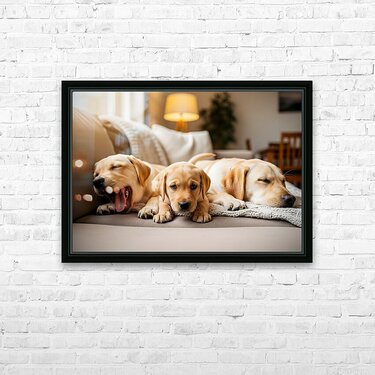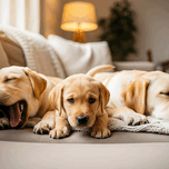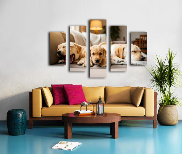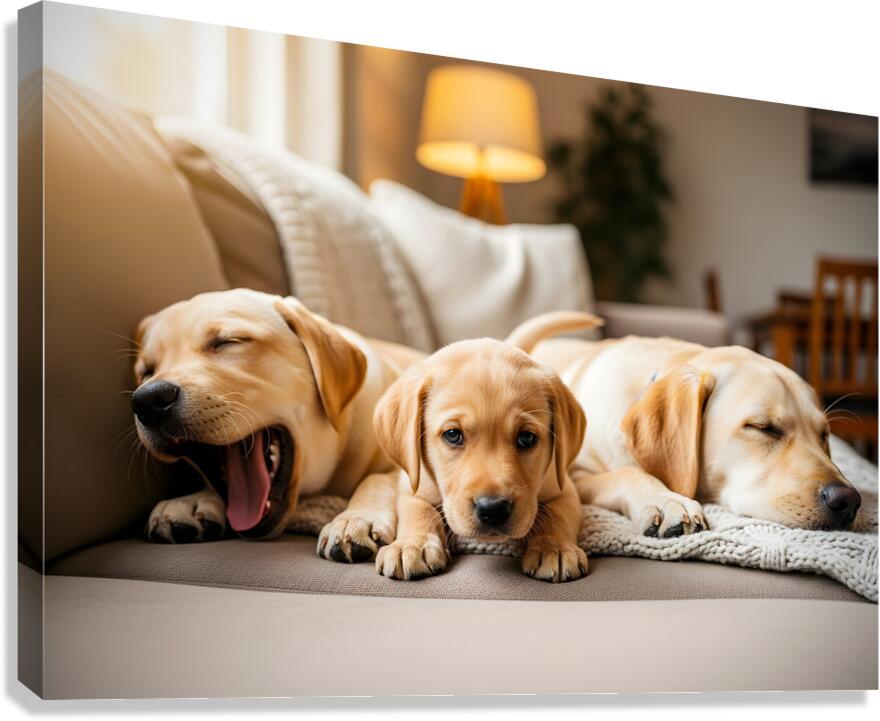 A young golden Labrador Retriever puppy sits among a group of other puppies on a beige couch. The puppies are various colors and breeds all snuggled together in the cozy indoor setting with warm natural lighting. Digital Artwork.
