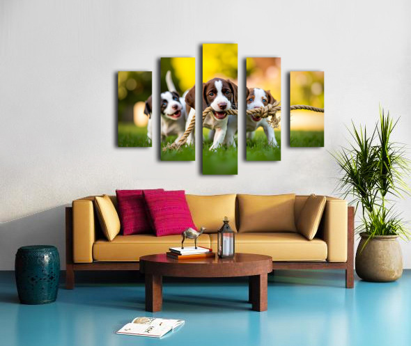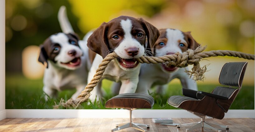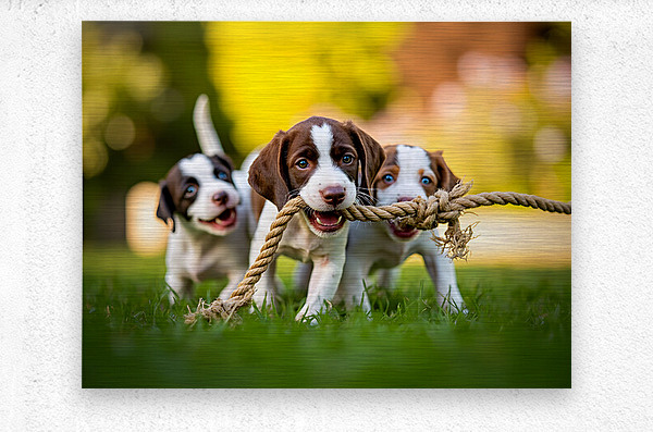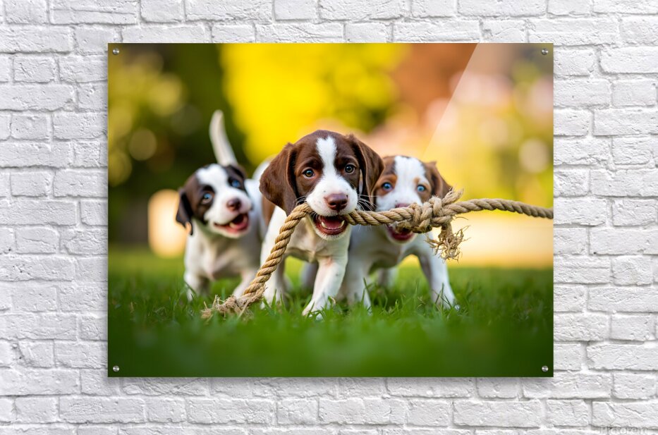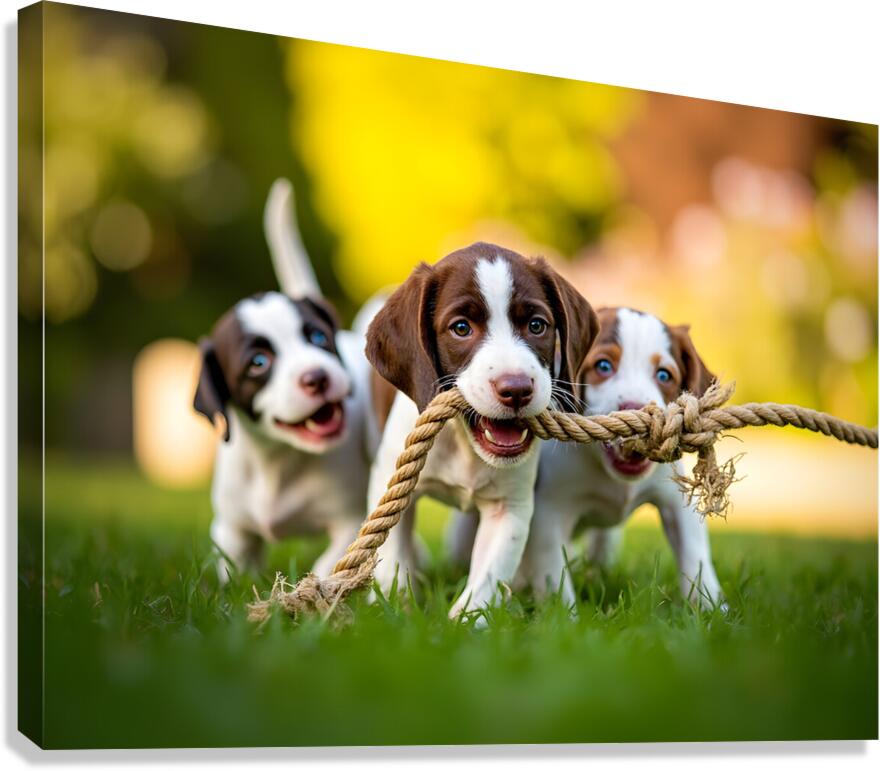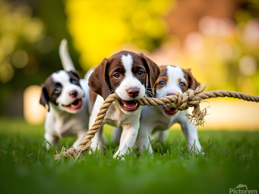 A young German Shorthaired Pointer puppy with brown and white spotted coat stands on green grass tail wagging as it spots a large rope toy. Three littermate puppies play nearby in the sunny backyard setting. Digital Artwork.