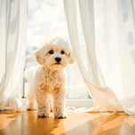 POODLE PUPPY PEEKING BEHIND BURGUNDY CURTAINS