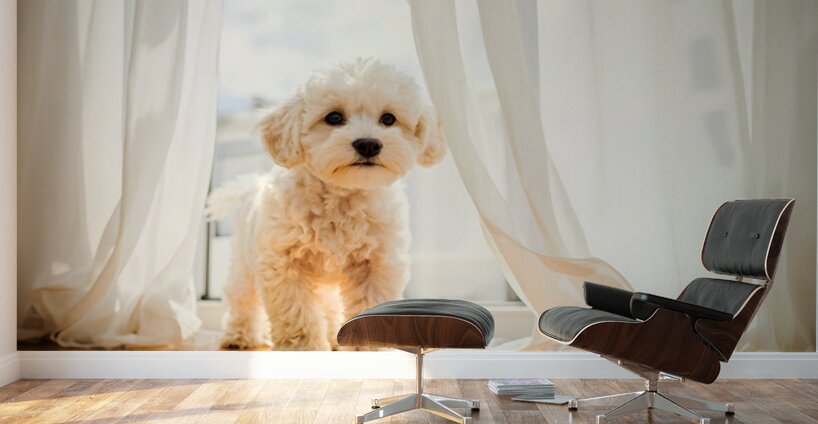 A fluffy white poodle puppy with curly fur hides behind rich burgundy velvet curtains showing only half of its adorable face and one curious dark eye as it peers out cautiously Digital Artwork.