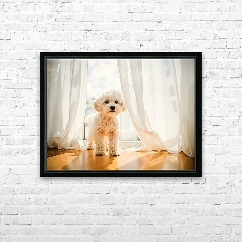 Poodle Puppy Peeking Behind Burgundy Curtains Picture Frame Printing