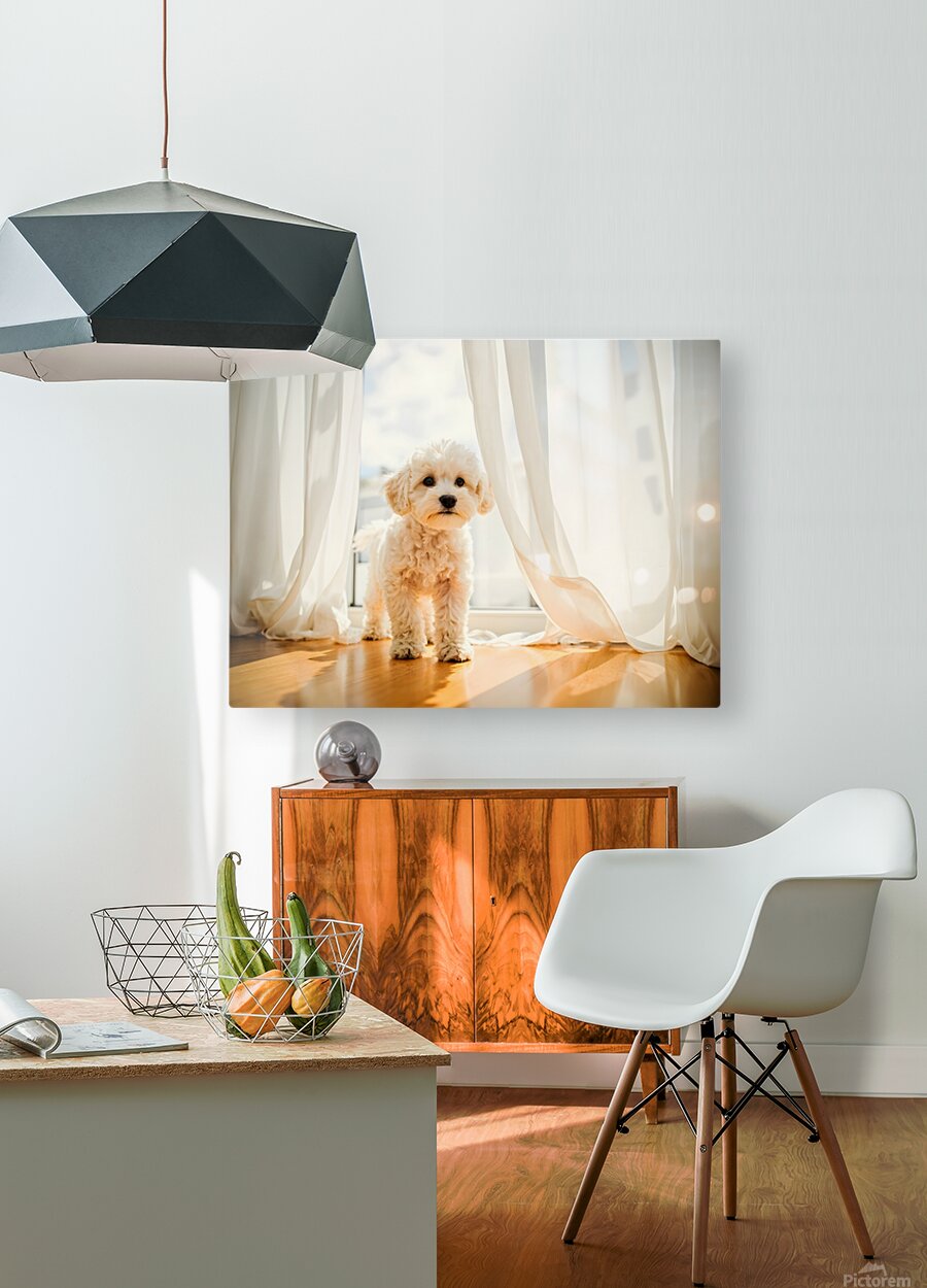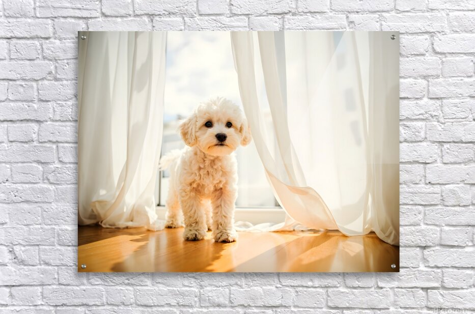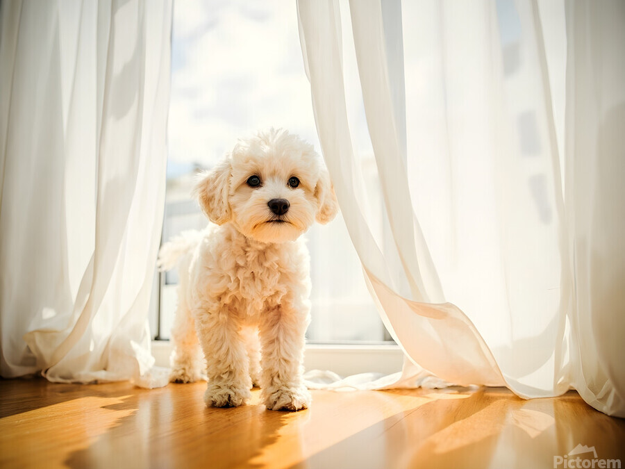 Poodle Puppy Peeking Behind Burgundy Curtains Picture Frame Printing