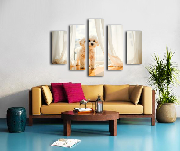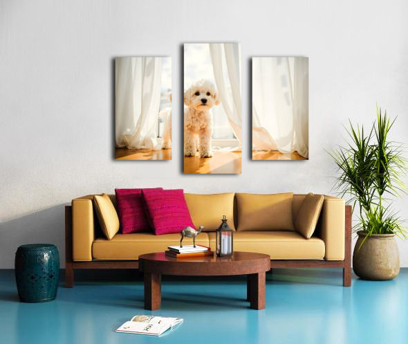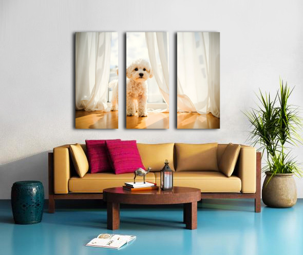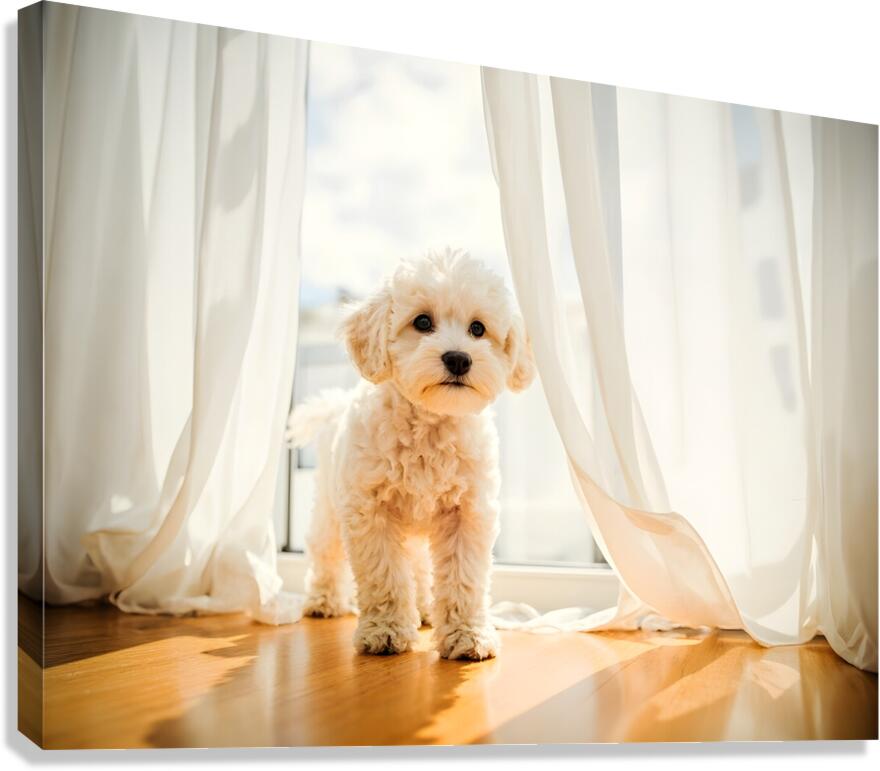 Poodle Puppy Peeking Behind Burgundy Curtains Canvas print