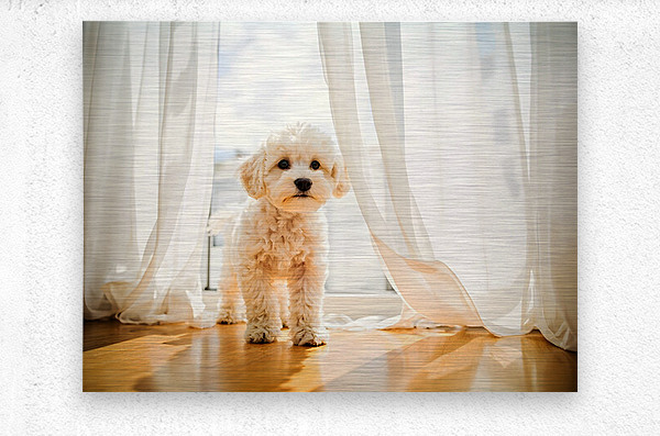 ABOUT THIS ARTWORK: POODLE PUPPY PEEKING BEHIND BURGUNDY CURTAINS
